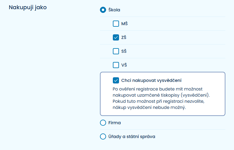 Při registraci je nutné vybrat příslušný stupeň školy a zároveň zaškrtnout volbu „Chci nakupovat vysvědčení“. Pokud tato volba není aktivní, systém nákup vysvědčení neumožní – i když je účet školy jinak plně funkční.