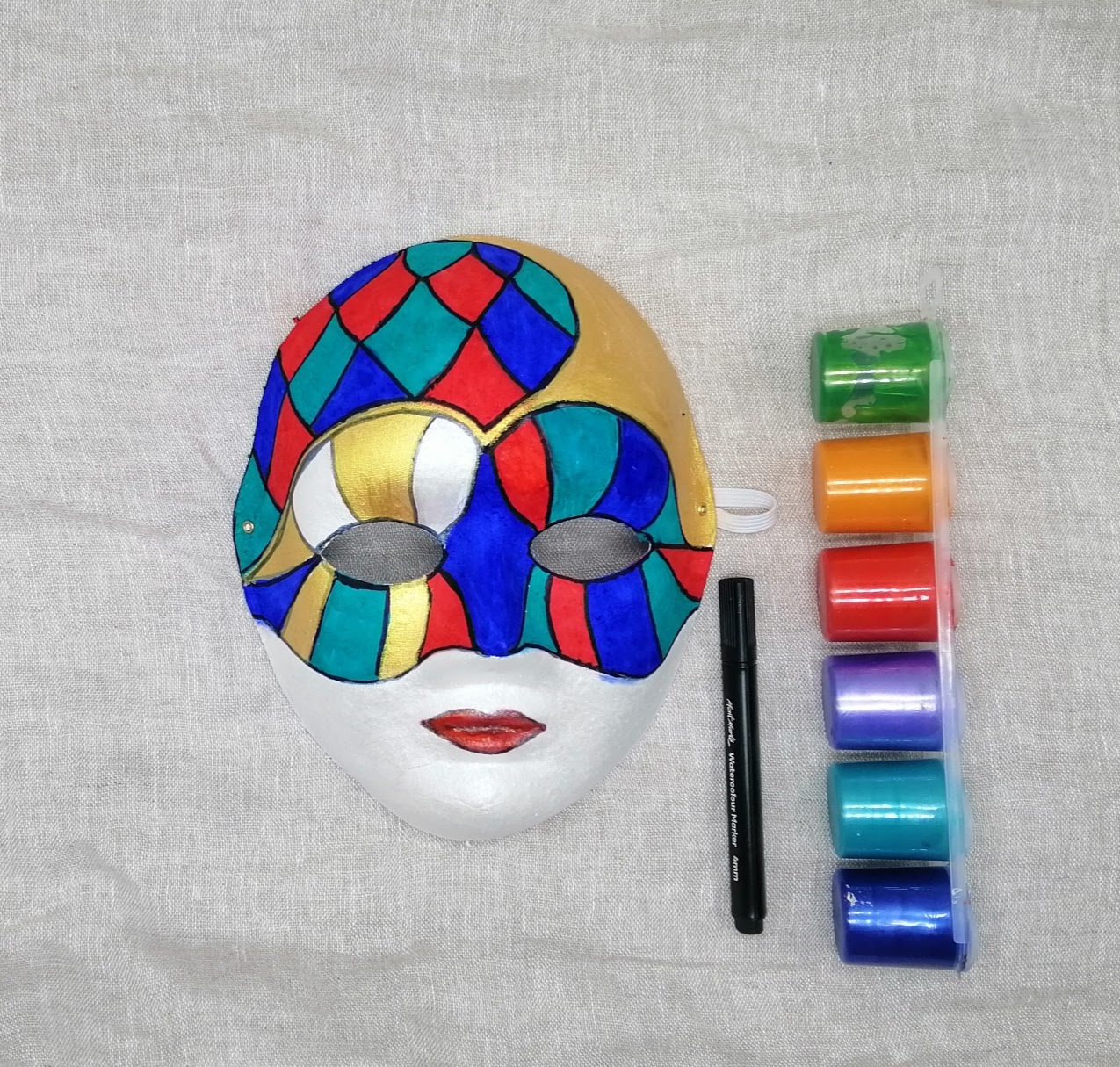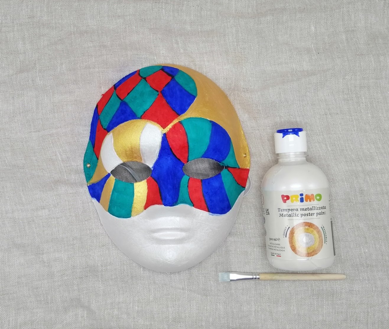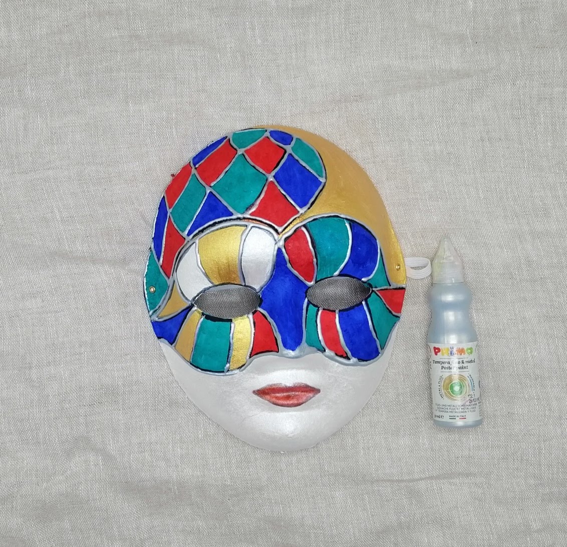 4. Perleťovou temperovou barvou dobarvíme dolní půlku masky.