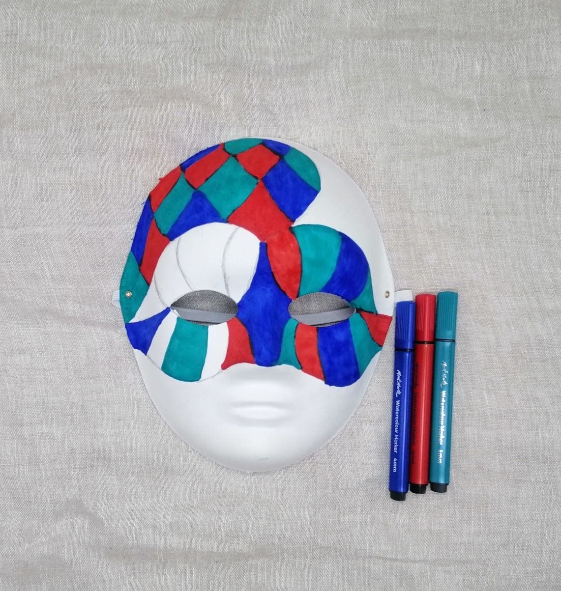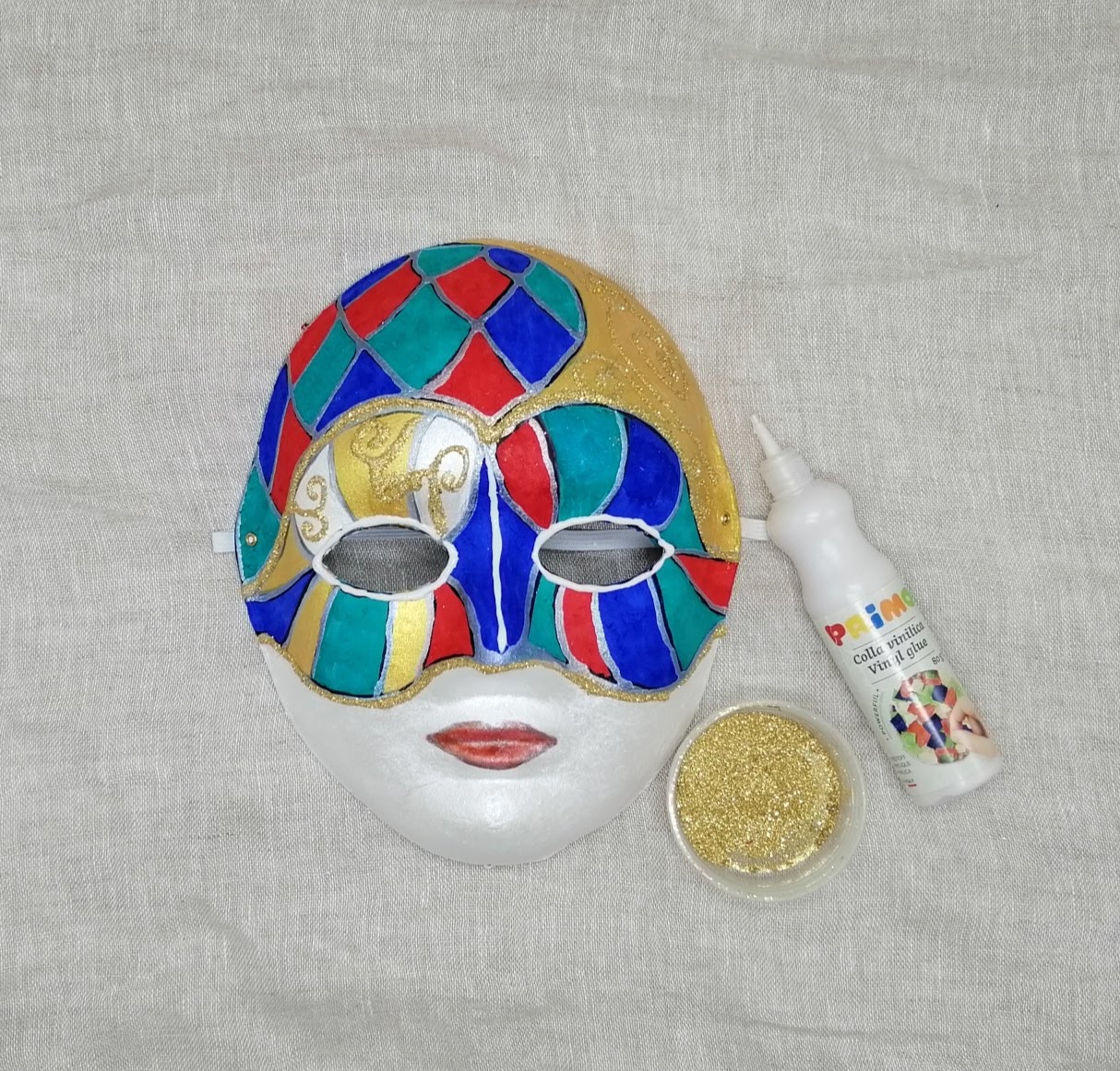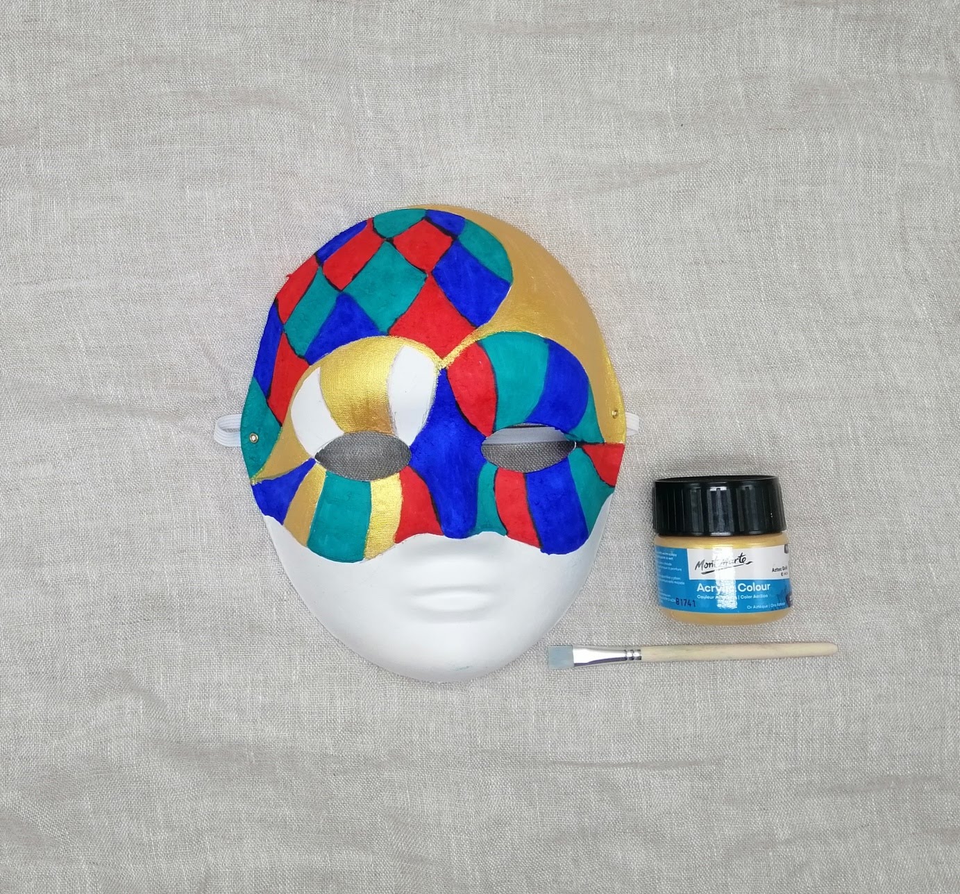 4. Perleťovou temperovou barvou dobarvíme dolní půlku masky.
