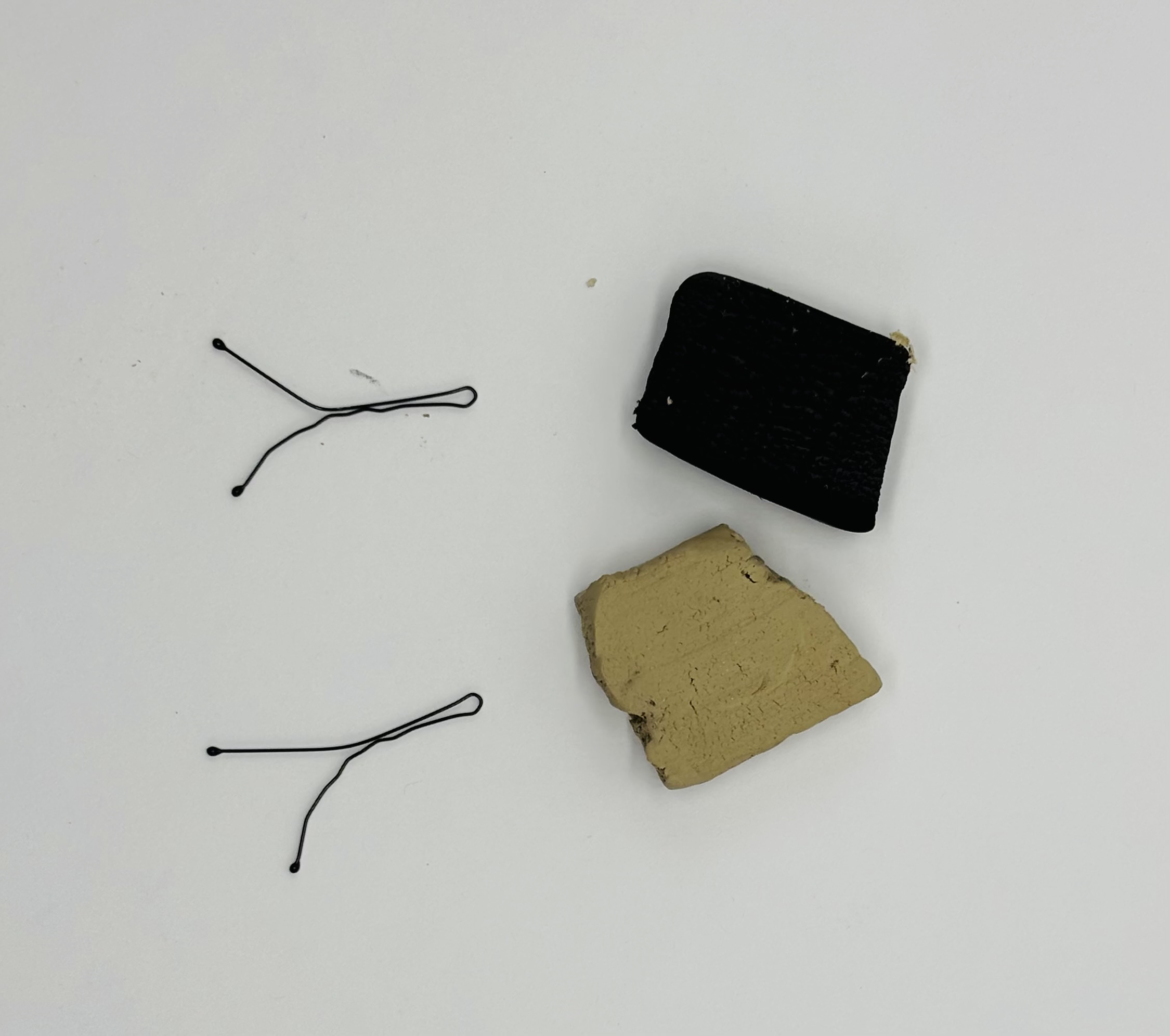 1. Připravíme si kousky samotvrdnoucí hmoty a sponky do vlasů stejným způsobem, jaký je znázorněn na obrázku.