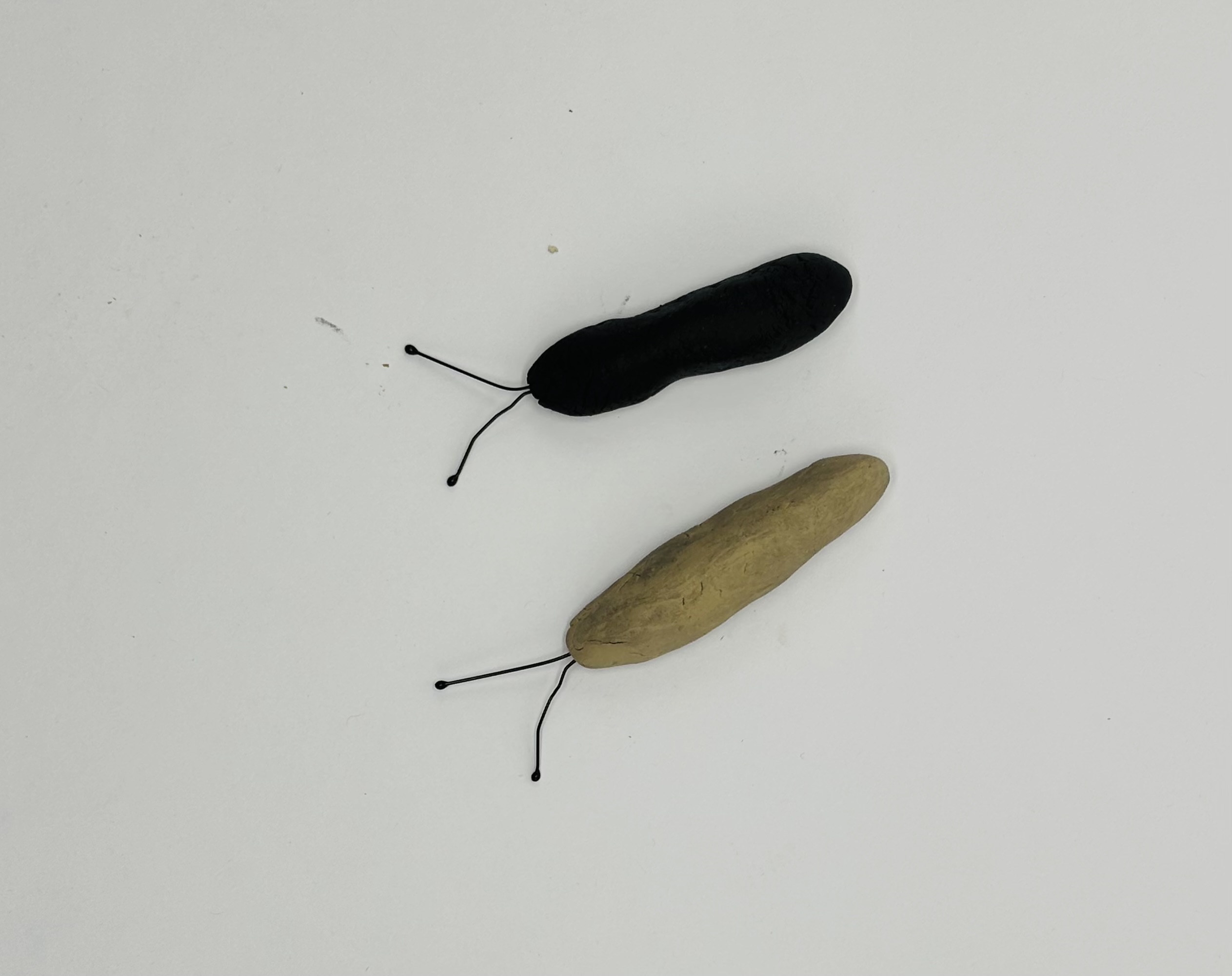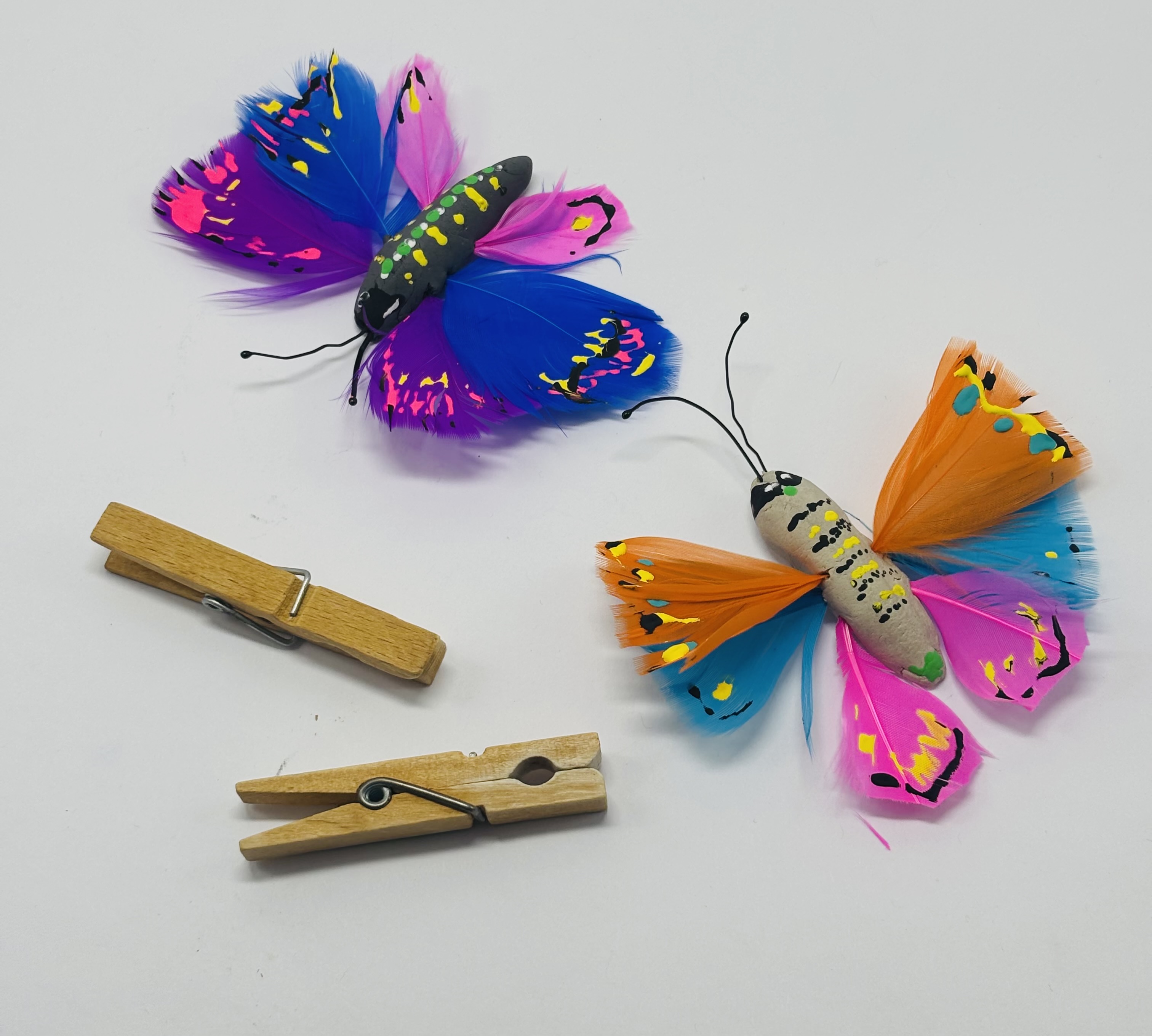 2. Ze samotvrdnoucí hmoty vymodelujeme tělíčka motýlů a zapíchneme do nich sponky jako tykadla.