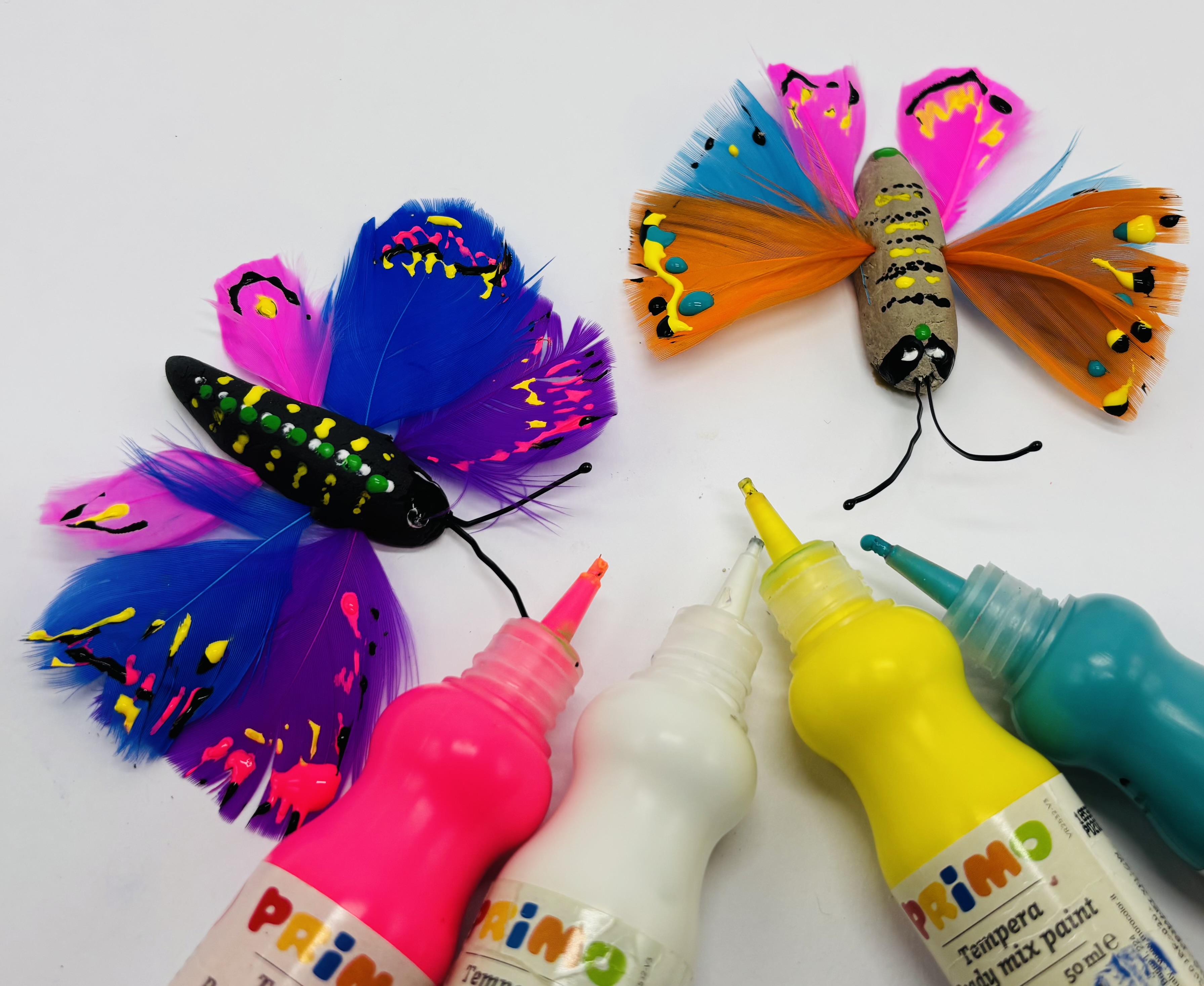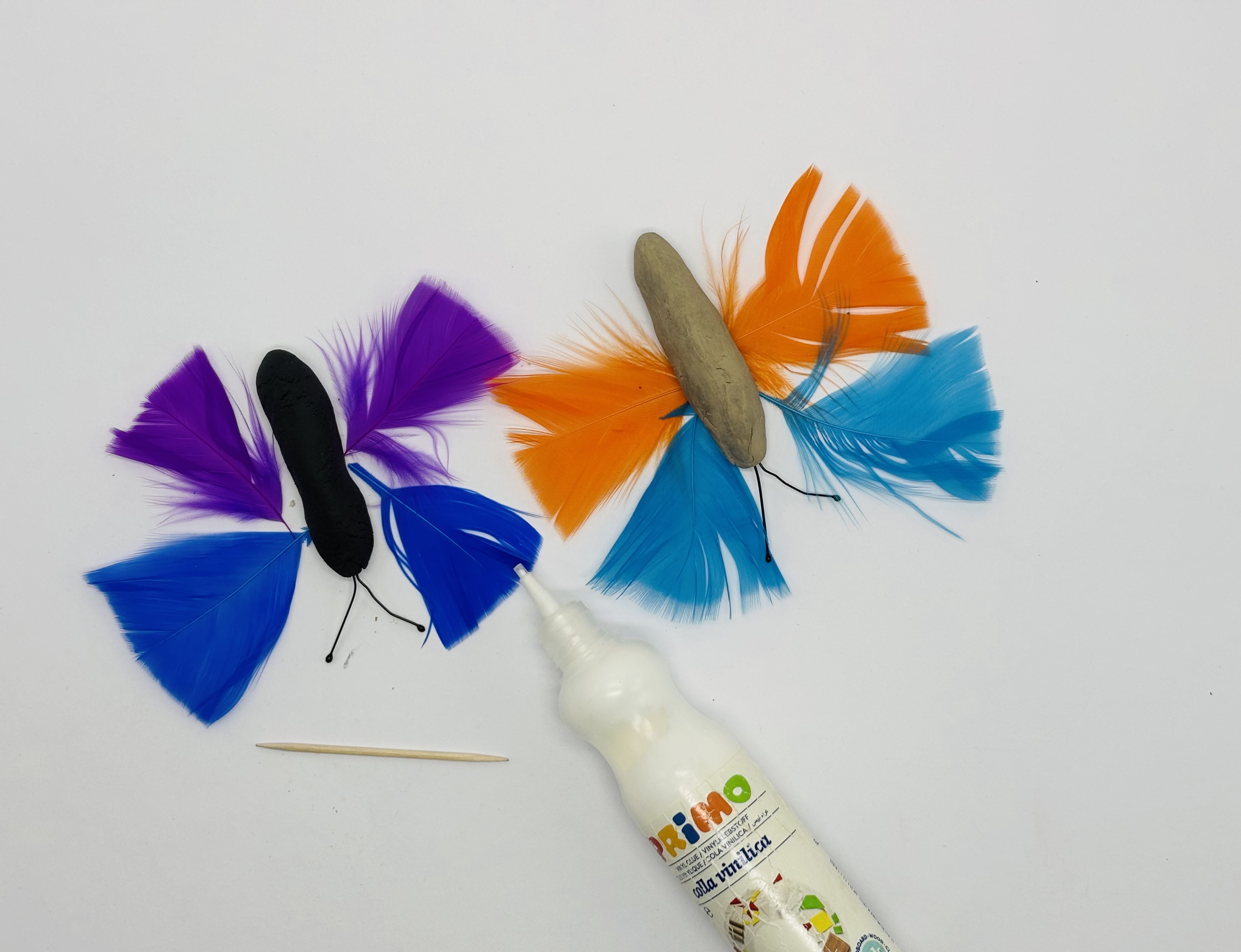 3. Peří upravíme nůžkami do požadovaného tvaru a velikosti. Do hotových tělíček vytvoříme pomocí parůžku malé otvory. Do každého z nich kápneme trochu lepidla a následně do nich zasuneme peříčka tak, aby připomínala motýlí křídla.