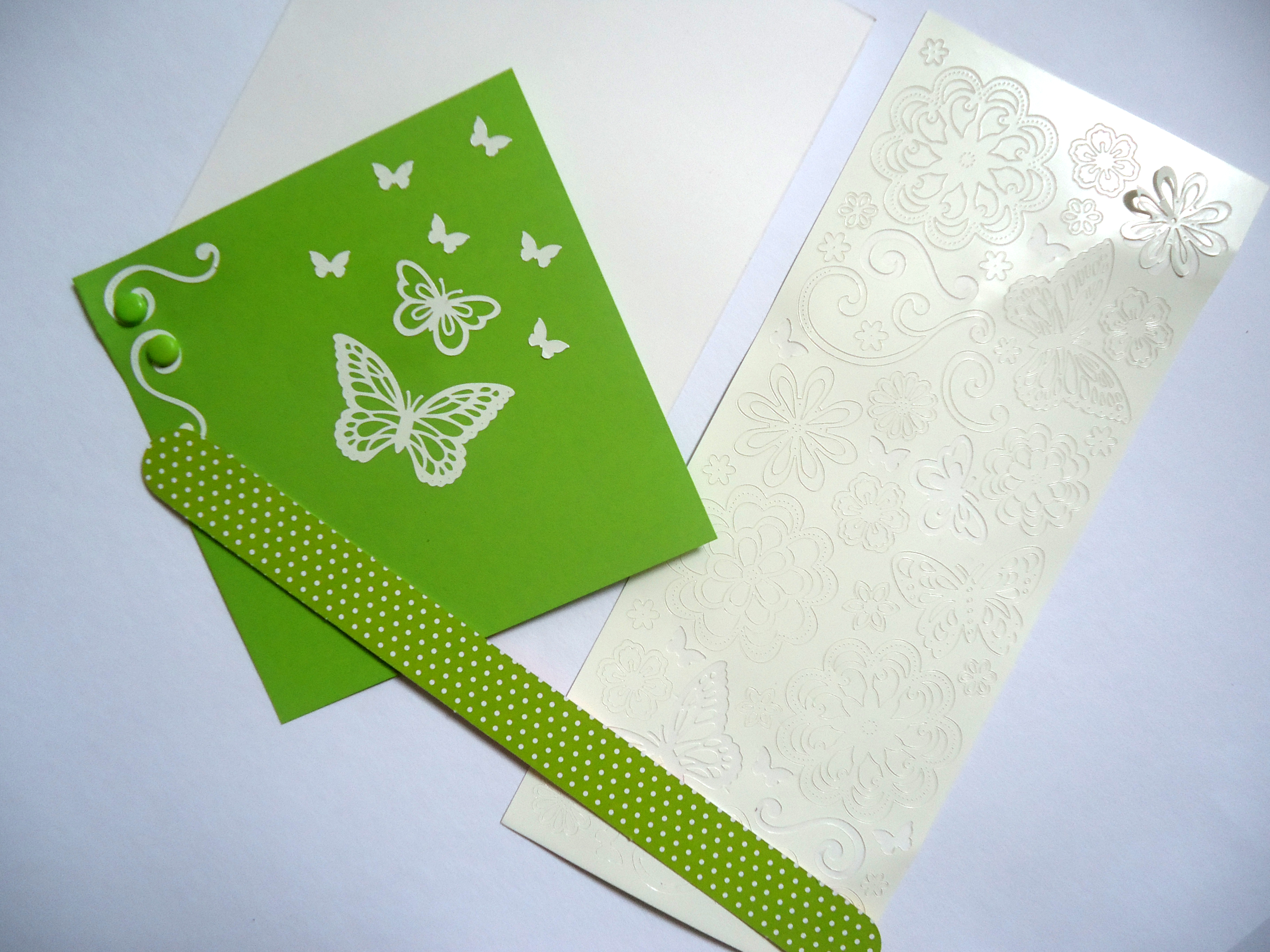 1. Toto přání je opravdu rychlovka. Na přáníčko si z barevného papíru vystřihneme odpovídající čtverec o něco menší, než je samotné přání, které dozdobíme samolepkami a hřebíčky z kreativní sady.