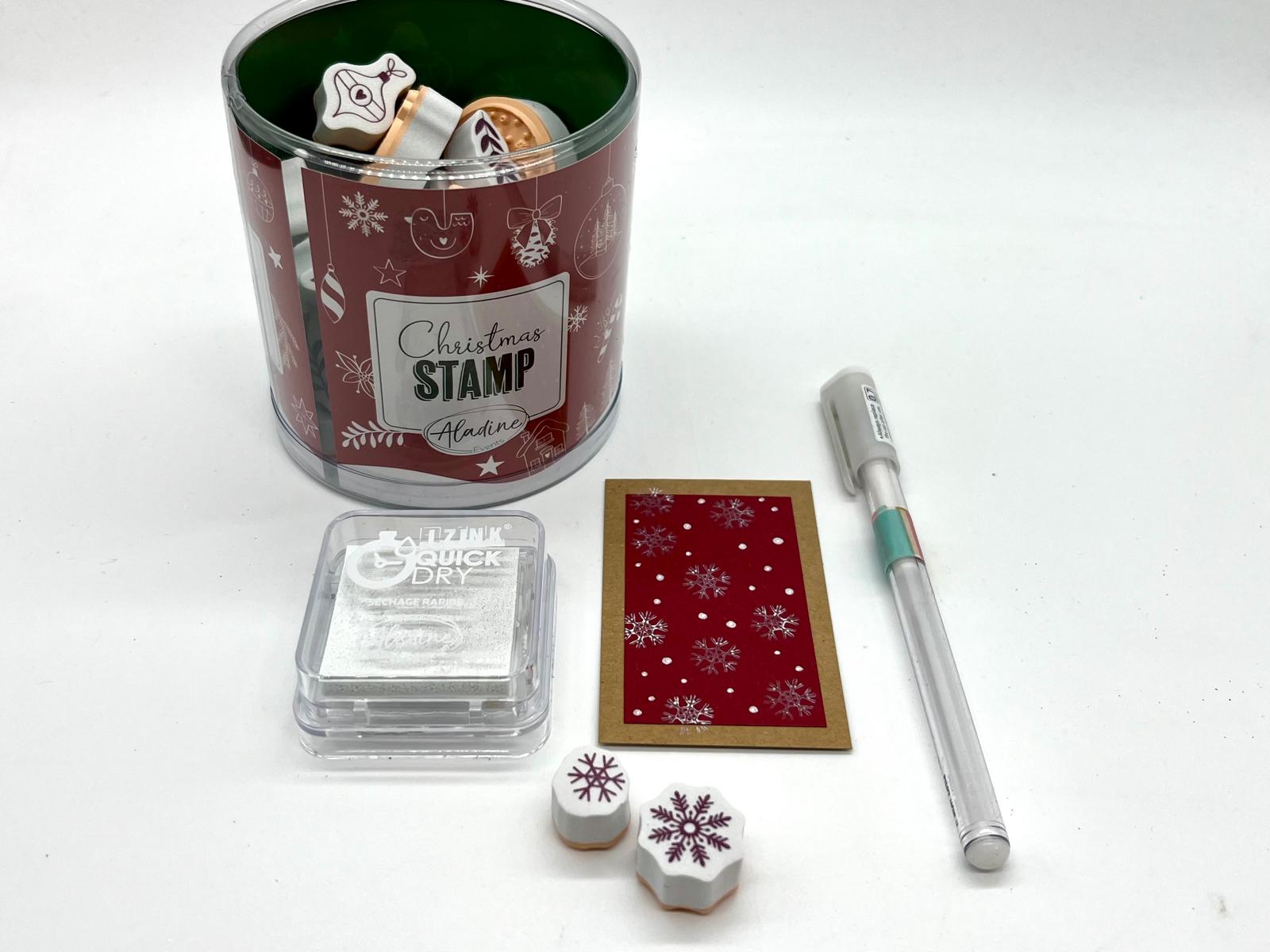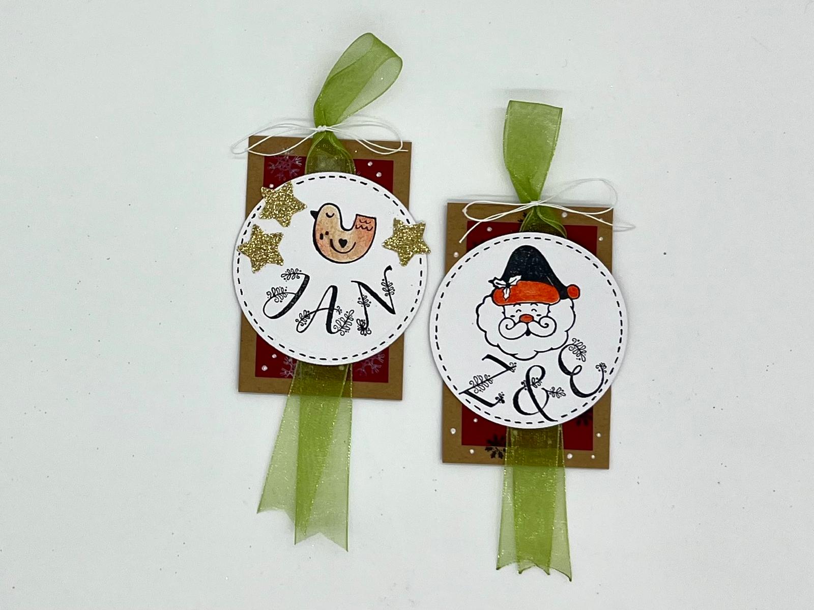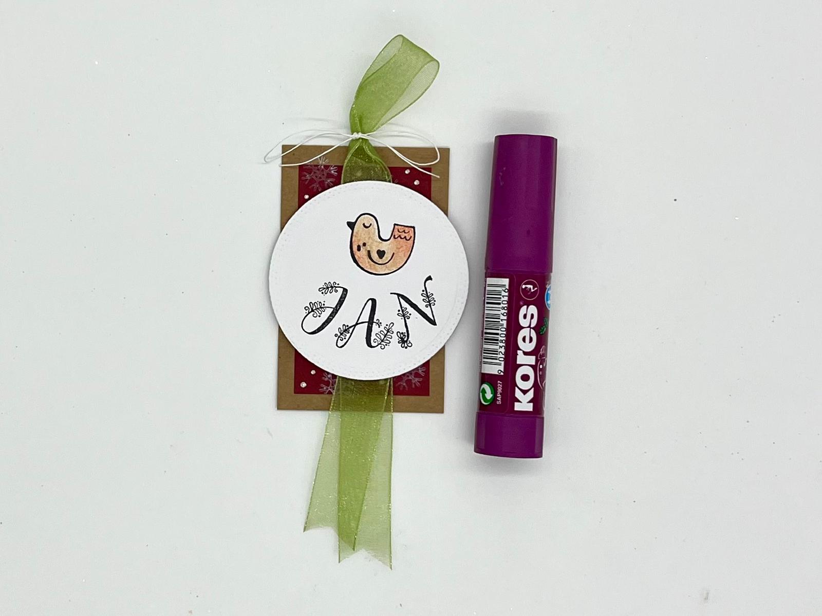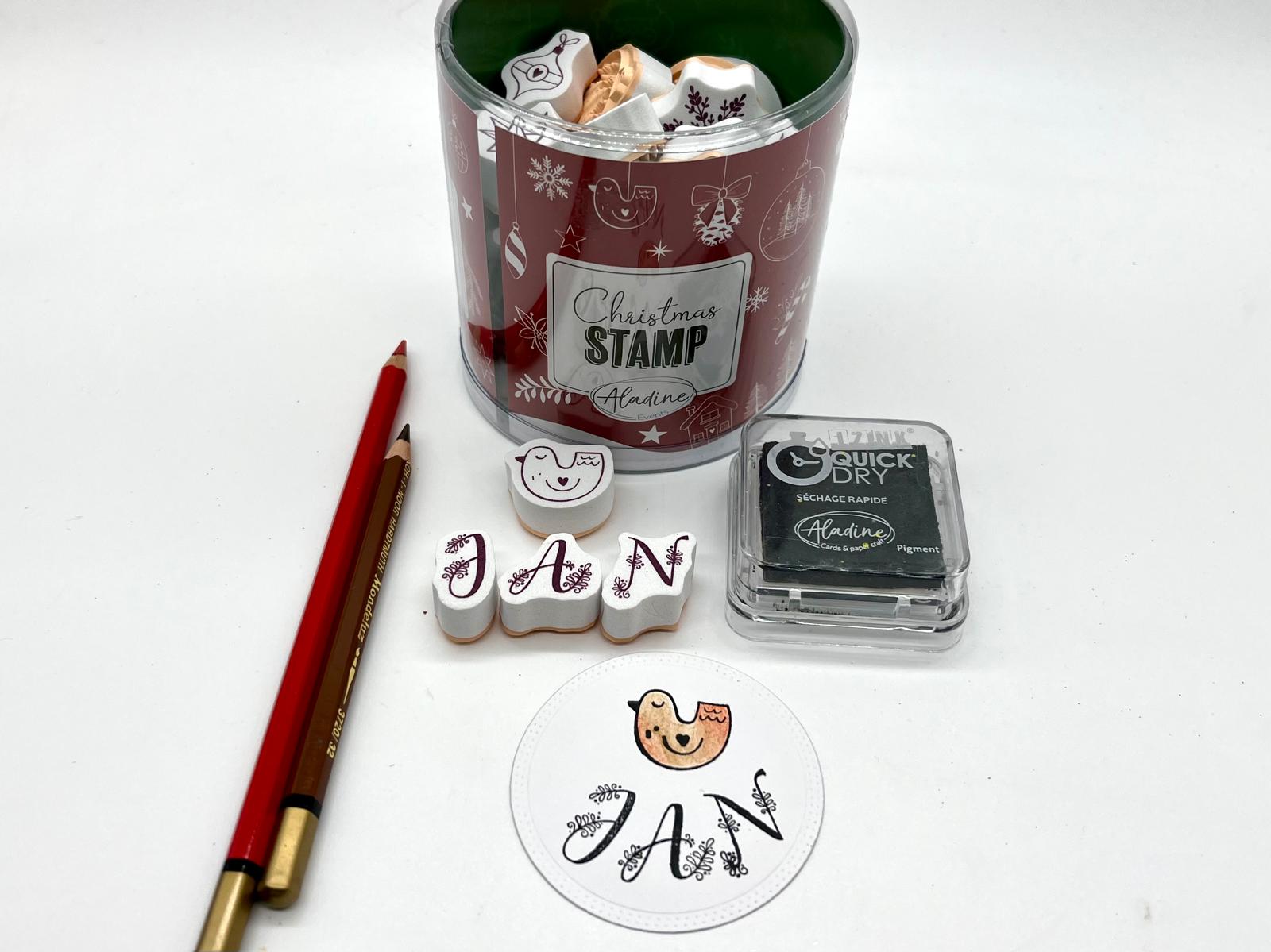 4. Z bílého papíru vystřihneme kolečko o průměru 5 - 6 cm, na které narazítkujeme jeden z motivů razítek, můžeme ho vybarvit pastelkami. Pod obrázek ještě narazítkujeme vánoční monogramy nebo celé jméno obdarovaného.