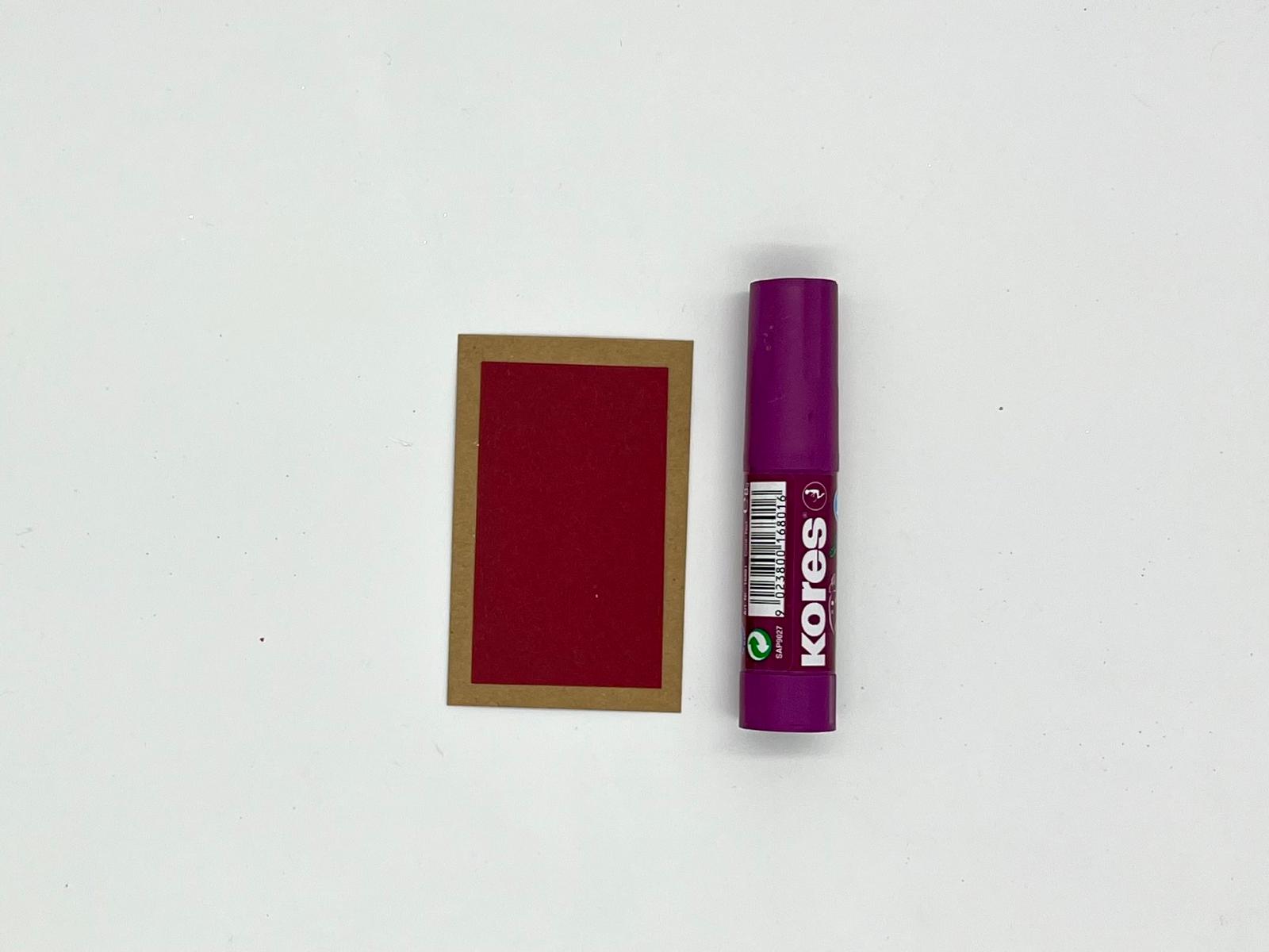 2. Z červeného papíru vystřihneme také kartičku, tentokrát ale o půl cm menší z každé strany, tedy 7 x 4 cm. Nalepíme ji na kraftový základ.