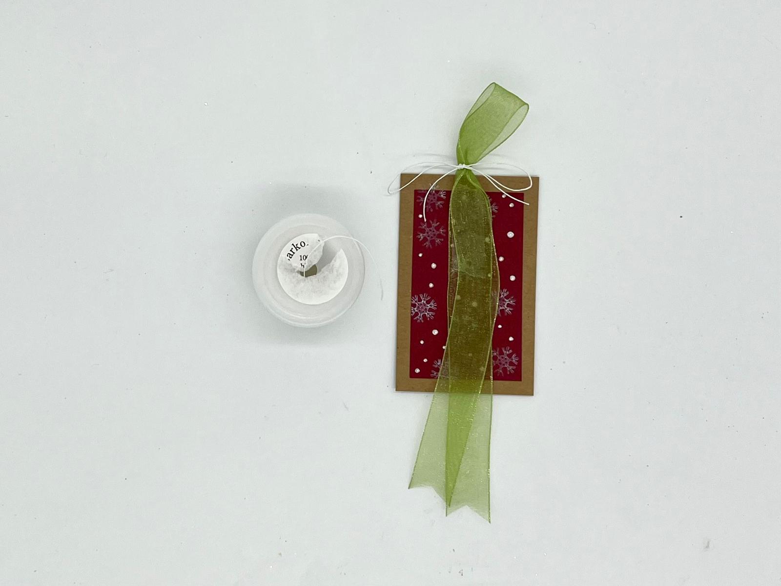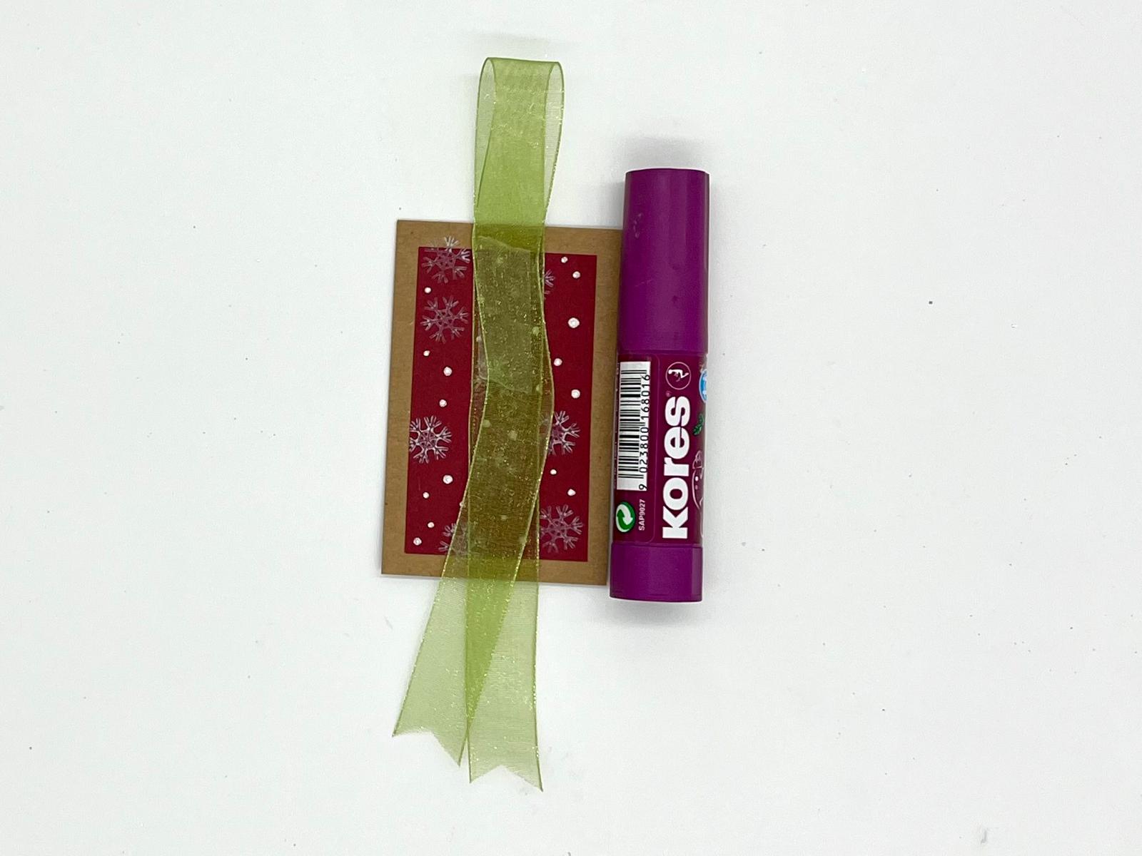 5. Ustřihneme si zelenou stuhu o délce cca 30 cm a přehneme ji napůl. Přilepíme ji na visačku tak, aby nahoře i dole přečnívala přibližně stejná délka a nahoře byla smyčka, dole dva cípy.
