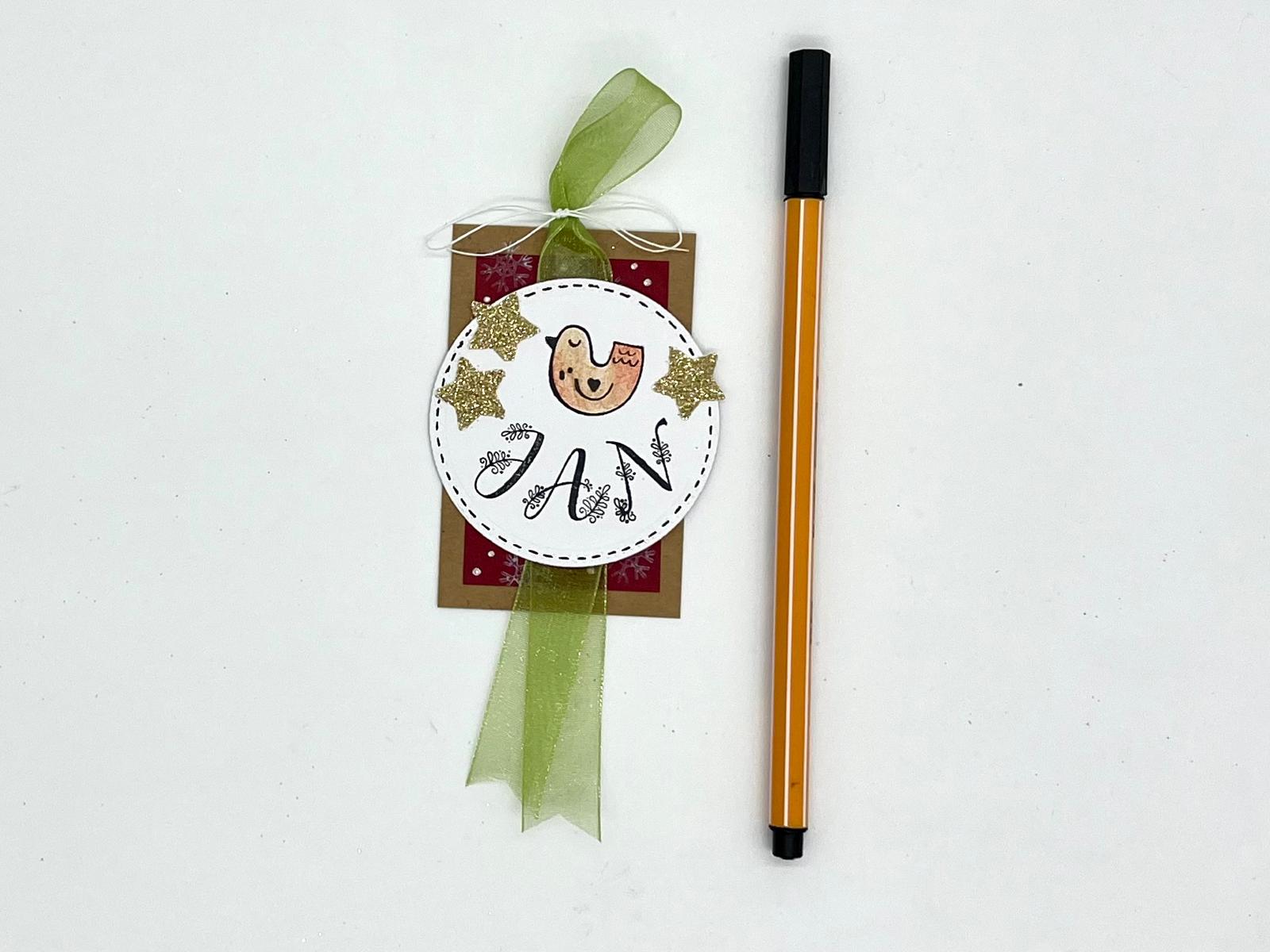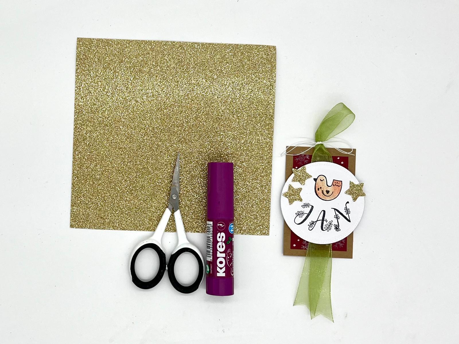 8. Ze zlatého glitrového papíru vystřihneme malé hvězdičky a nalepíme na visačku.