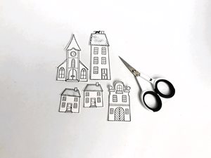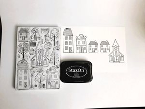 1. Na bílý papír narazítkujeme černým permanentním inkoustem domečky.