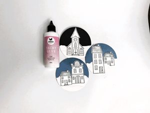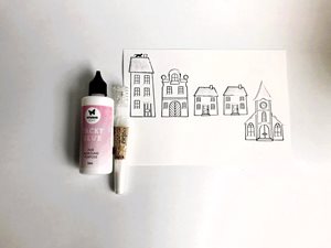 2. Na střechy, okapy a okna naneseme tekuté lepidlo, zasypeme bílými třpytkami a necháme zaschnout.