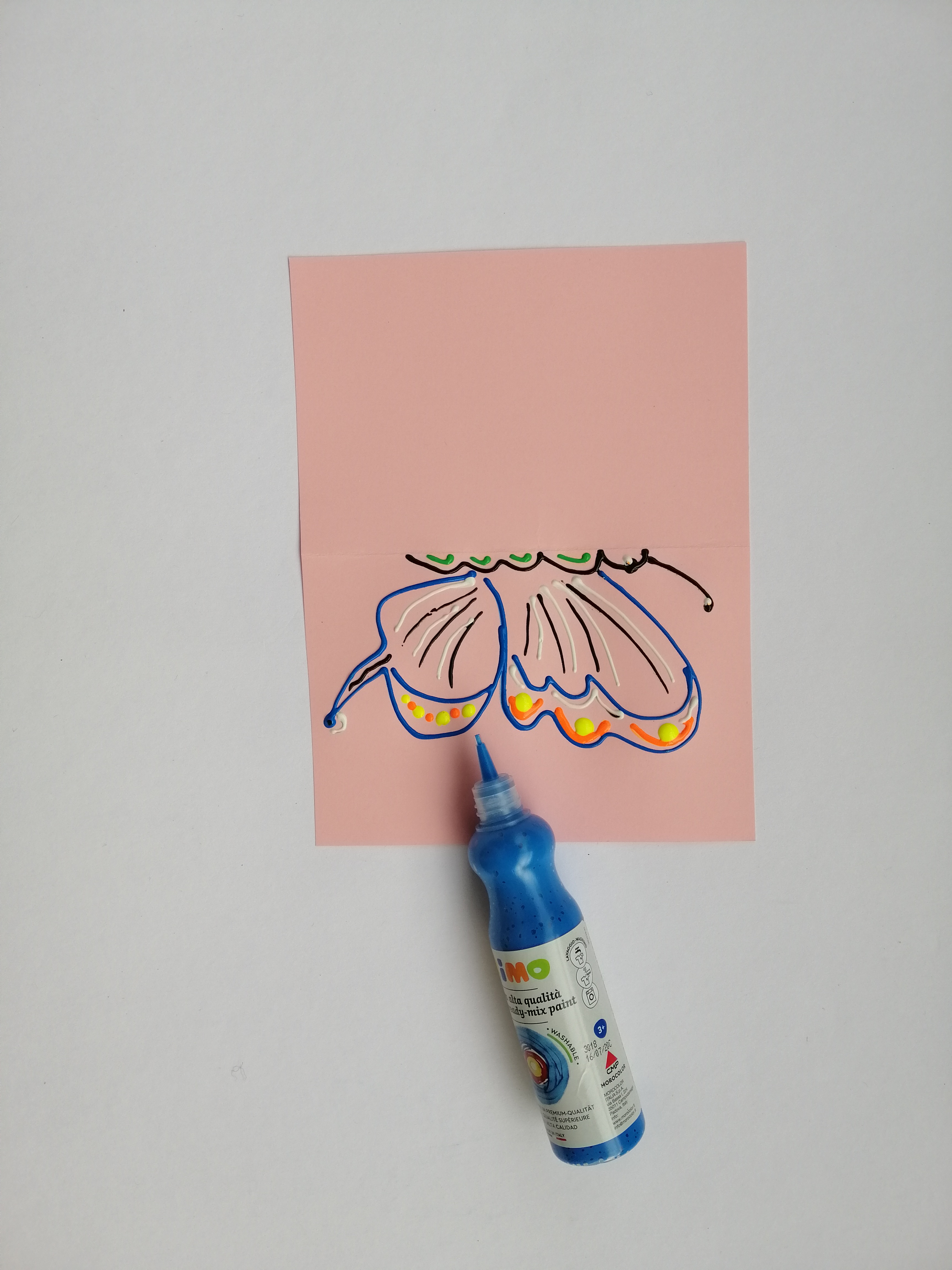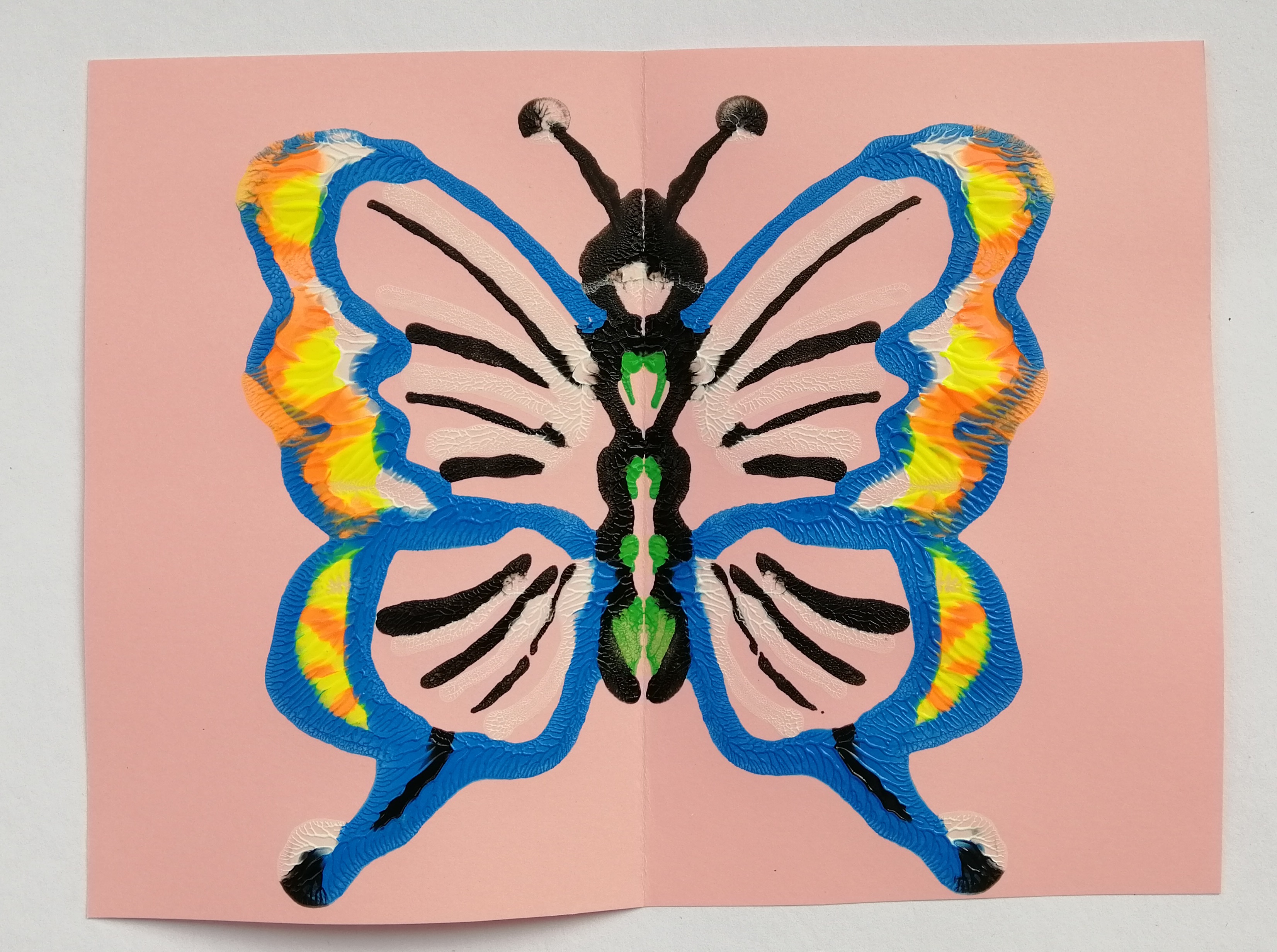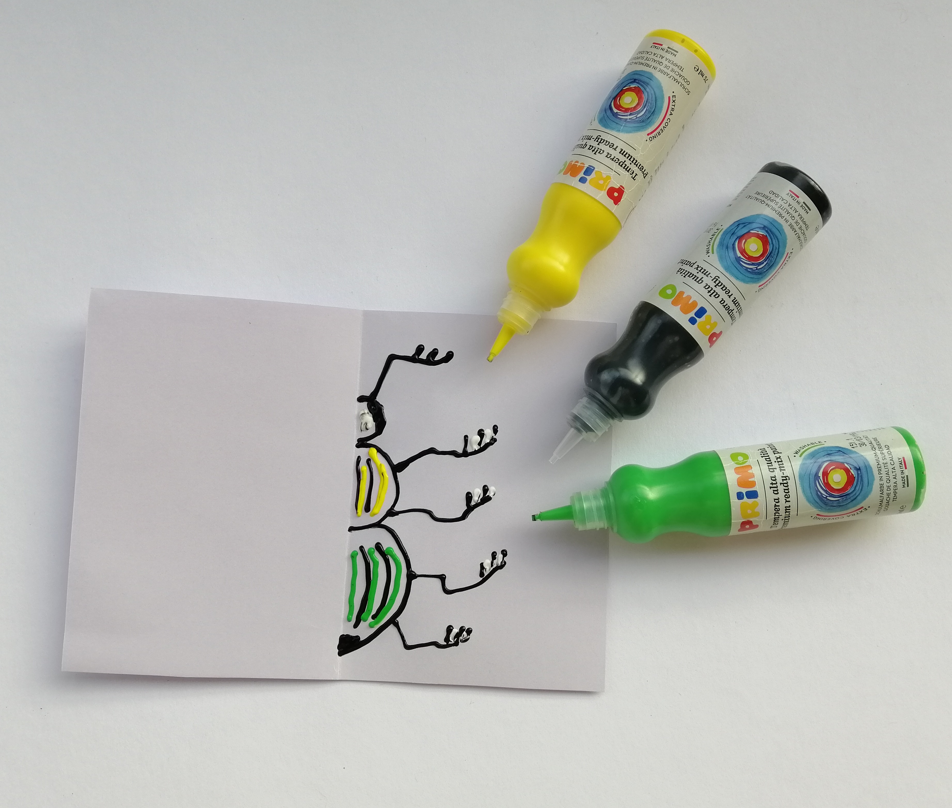 TIP: Pokud na obrázek použijete více barev, dosáhnete tím zajímavějších barevných efektů. Jako příklad tu máme brouka a motýlka. Po zaschnutí temper lze obrázek dále vybarvovat, vystřihovat a dále dotvářet.