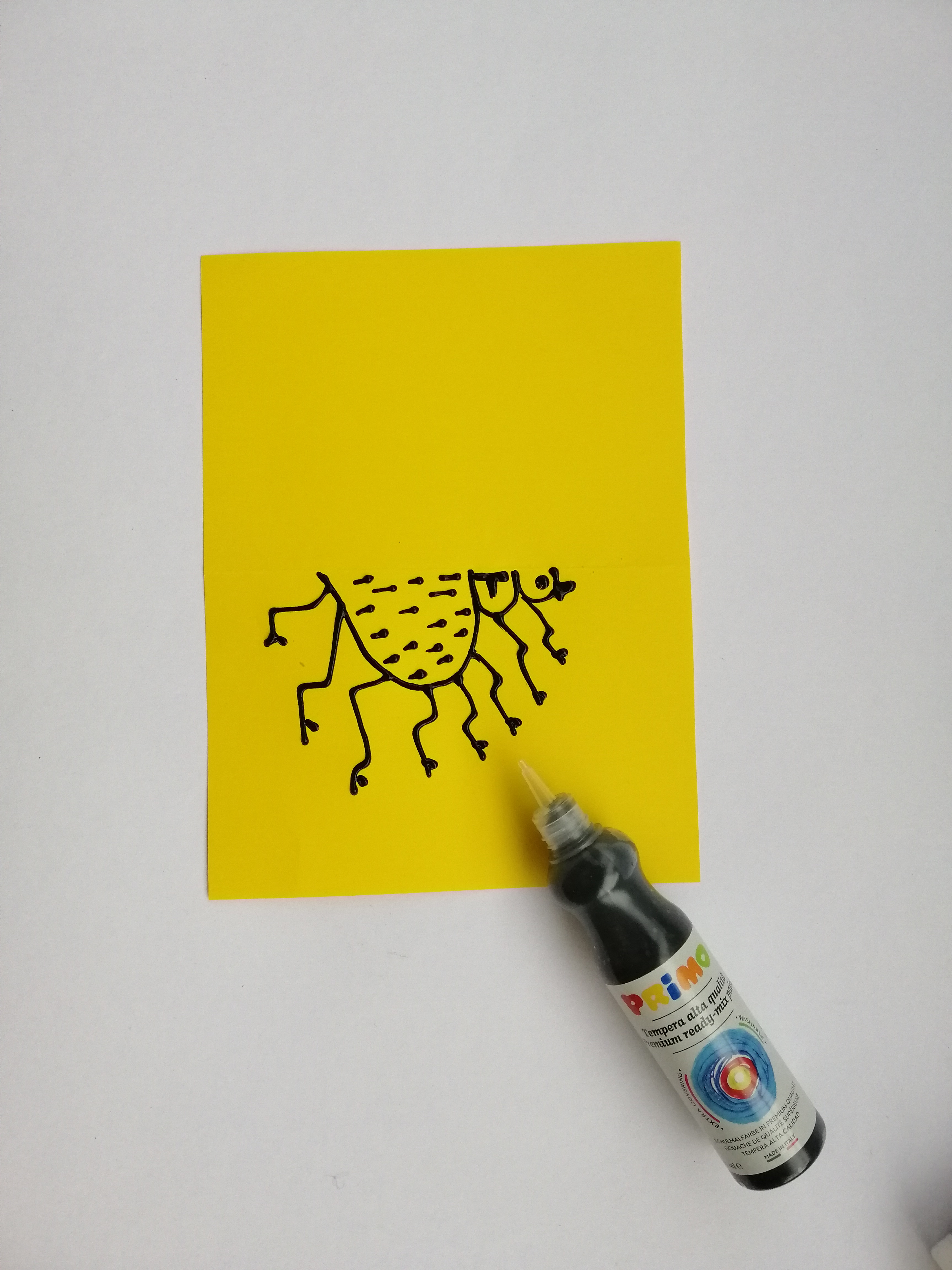 1. Karton přeložíme a zase otevřeme. Hrotem lahvičky namalujeme jemnou čarou půlku kontury pavouka.