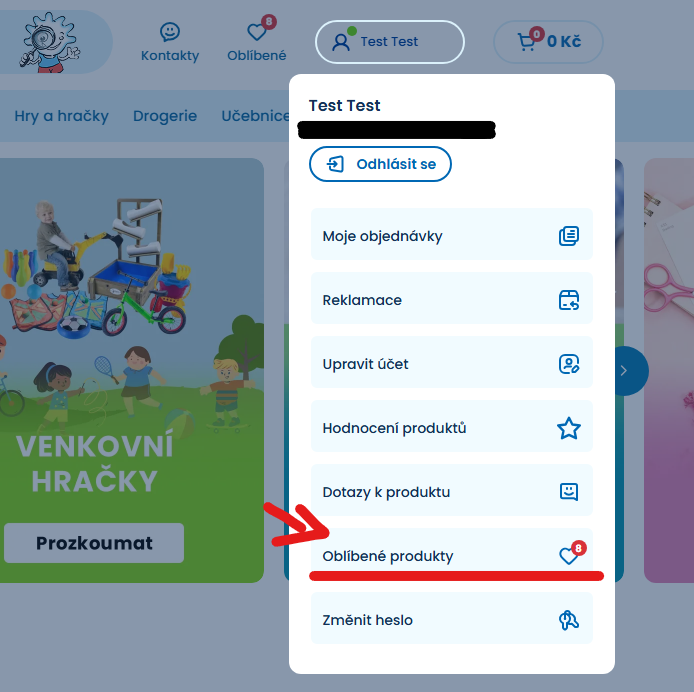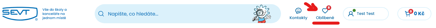 V pravé části stránky vedle vyhledávání najdete položku Oblíbené. Po kliknutí se vám zobrazí všechny produkty, které jste si uložili.