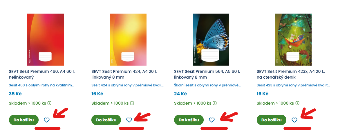 Když procházíte produkty na e-shopu, u každé položky najdete vedle tlačítka Do košíku také ikonu srdíčka. Stačí na ni kliknout a produkt se okamžitě uloží mezi vaše oblíbené.