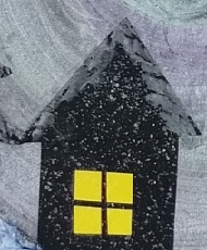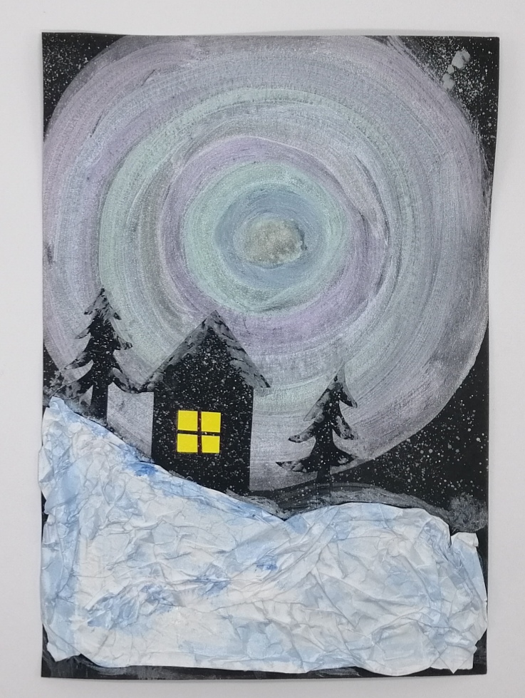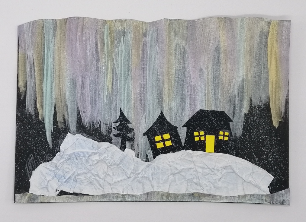 3. Z kartonu si vystřihneme domečky, stromy a okna. Vše nalepíme na obrázek.