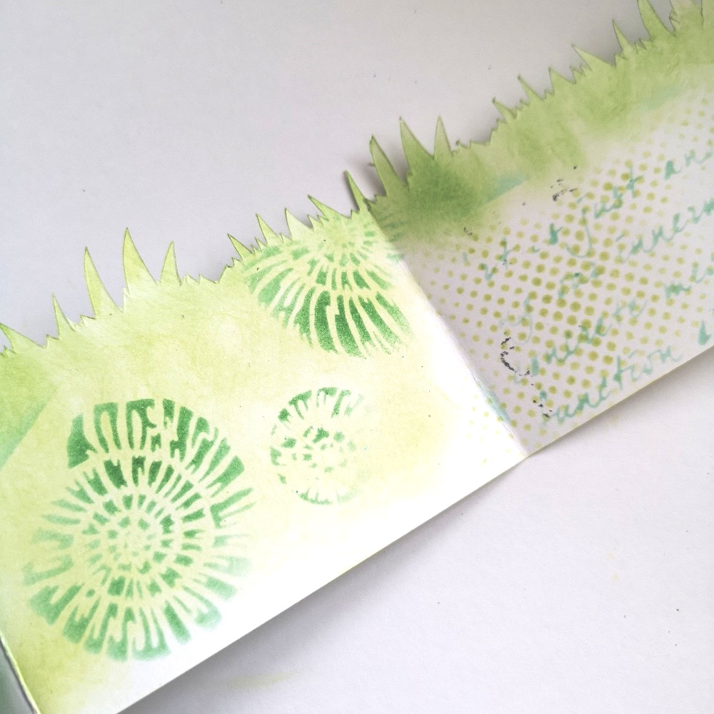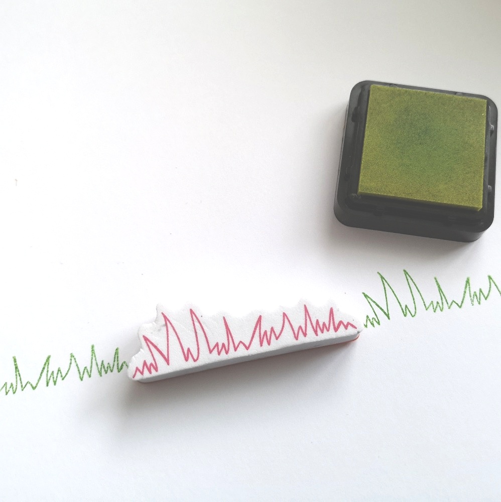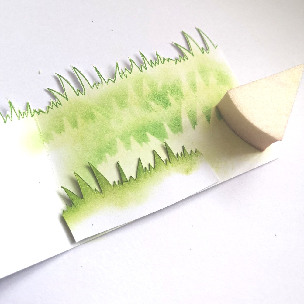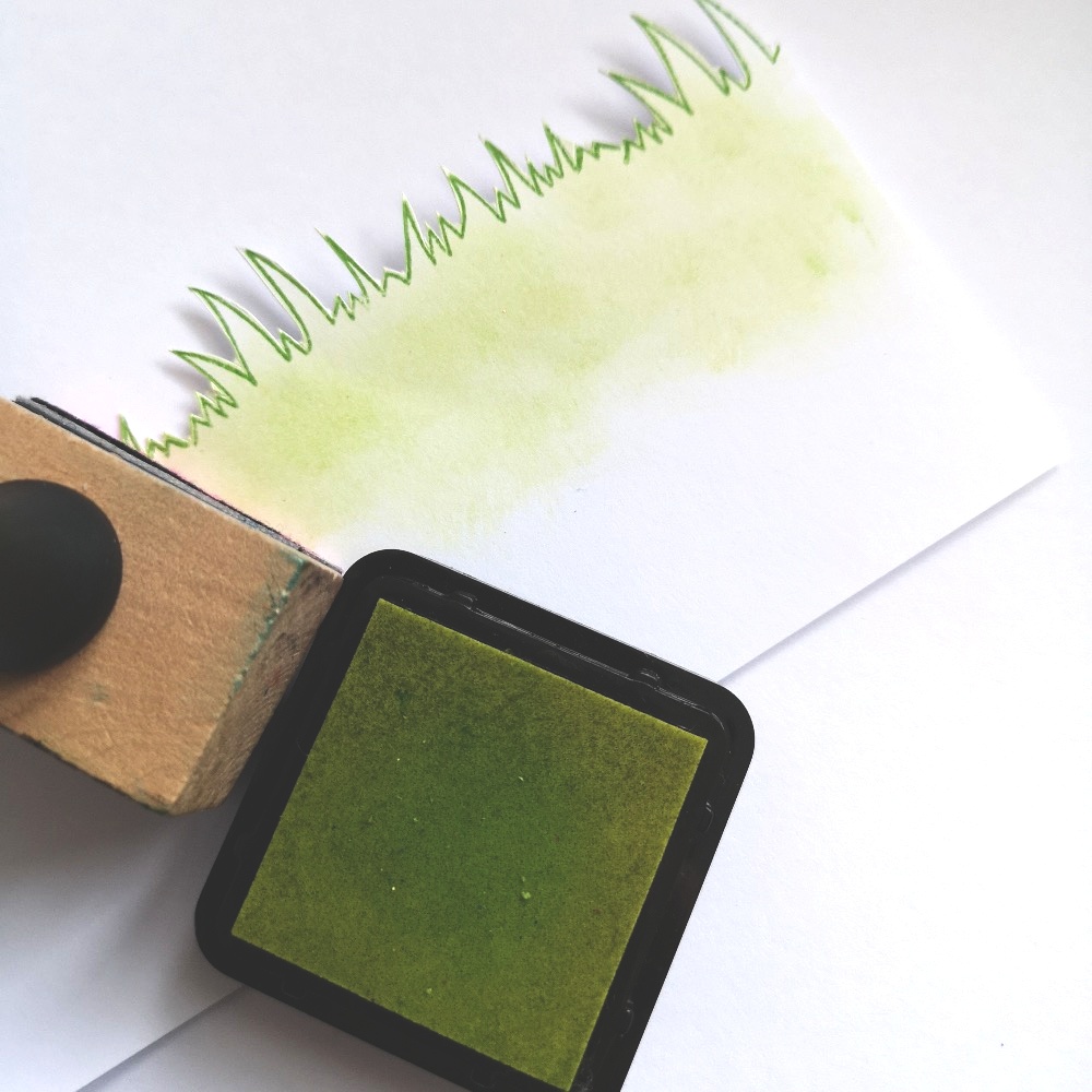 1. Na tvrdší papír narazítkujeme vedle sebe motiv trávy (v délce cca 30 cm a výšku zvolte podle toho jak chcete přání vysoké).