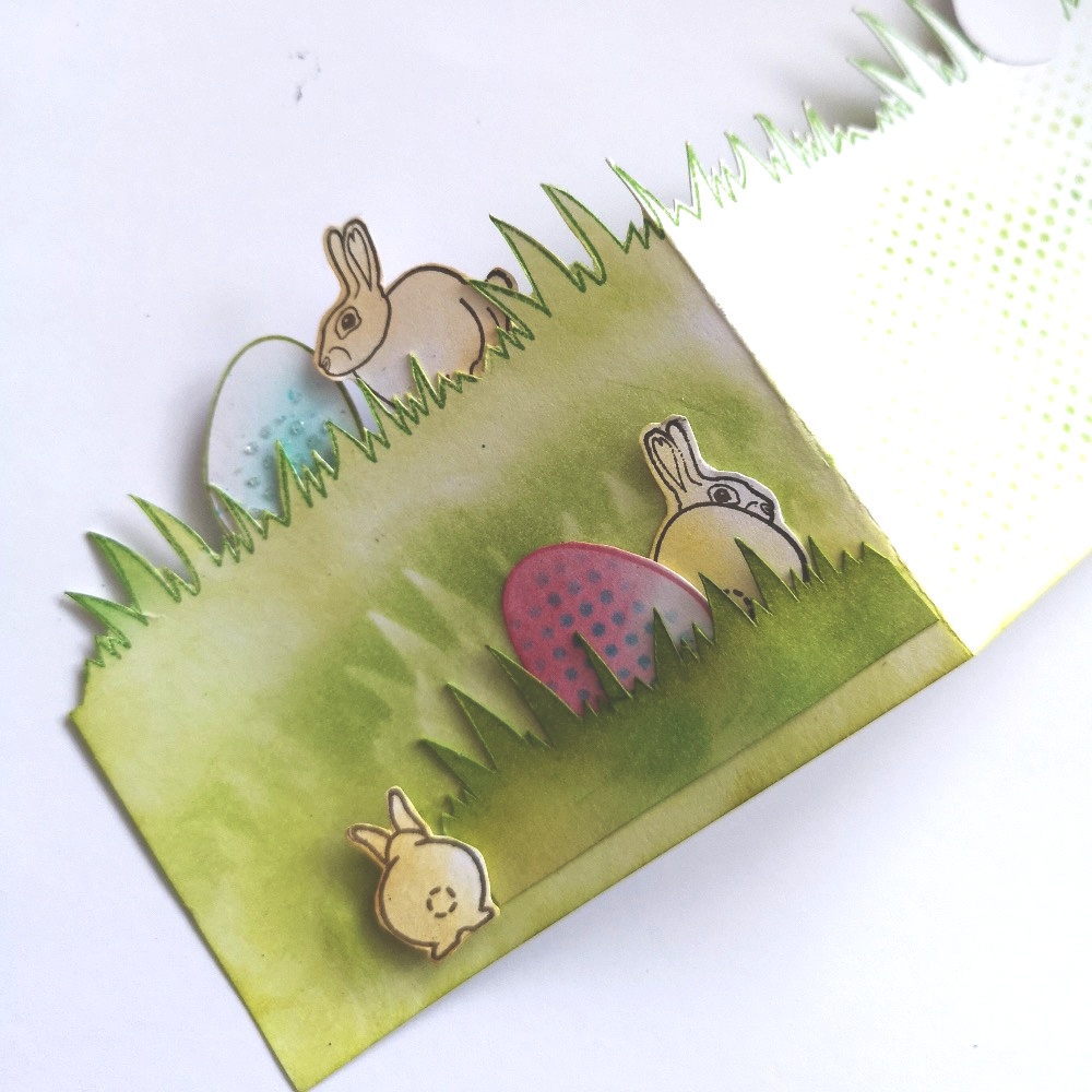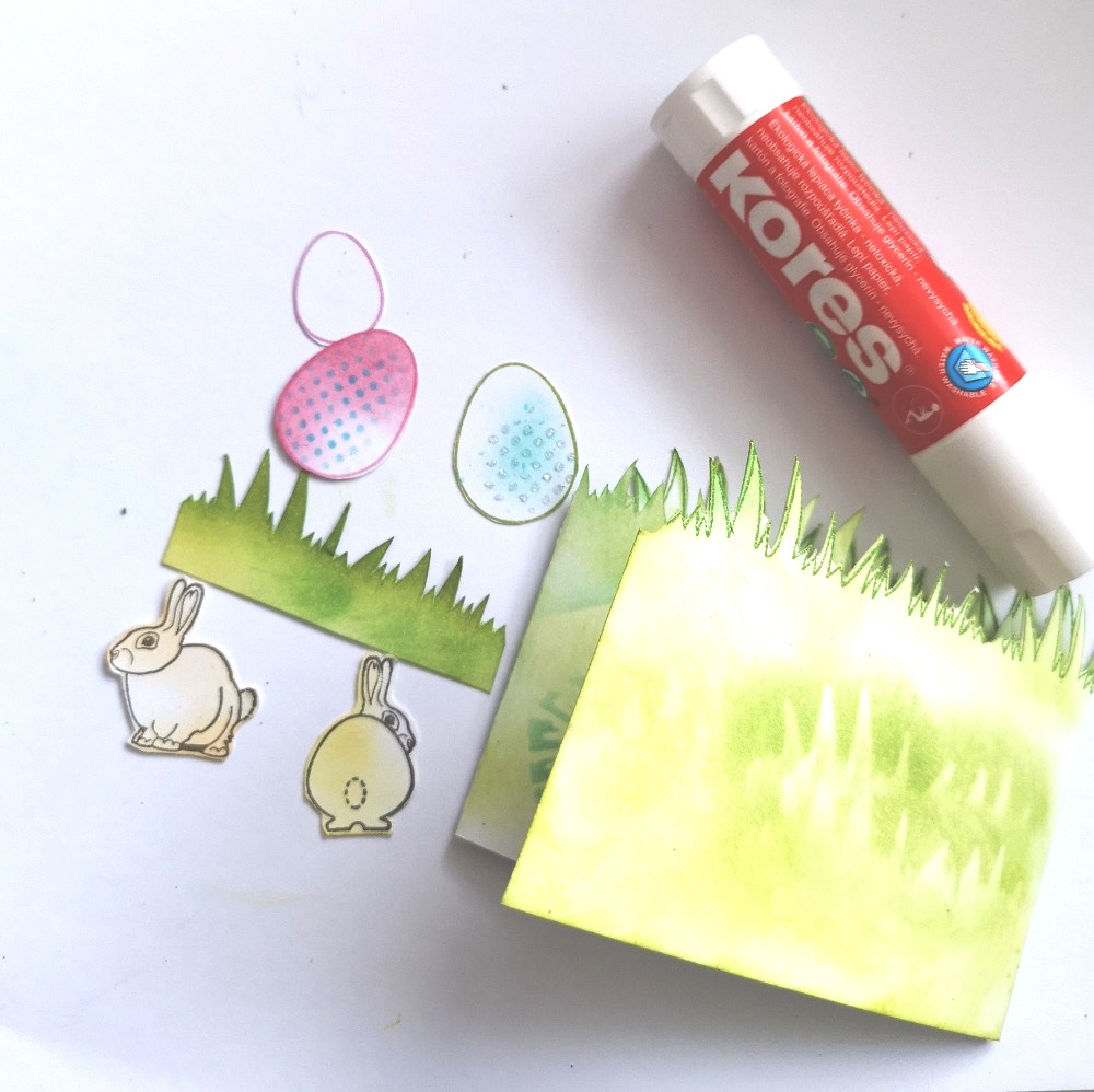 8. Vajíčka, zajíčky a beránka jemně zatónujte houbičkou a přilepte do trávy tak, aby na sebe pěkně navazovali při skládání. Nezapomeňte zabarvit i zadní stranu nalepených dekorací. Šablonu trávy použijte jako motiv na hlavní stranu. Zajíčka nalepte na 3D čtverečky.