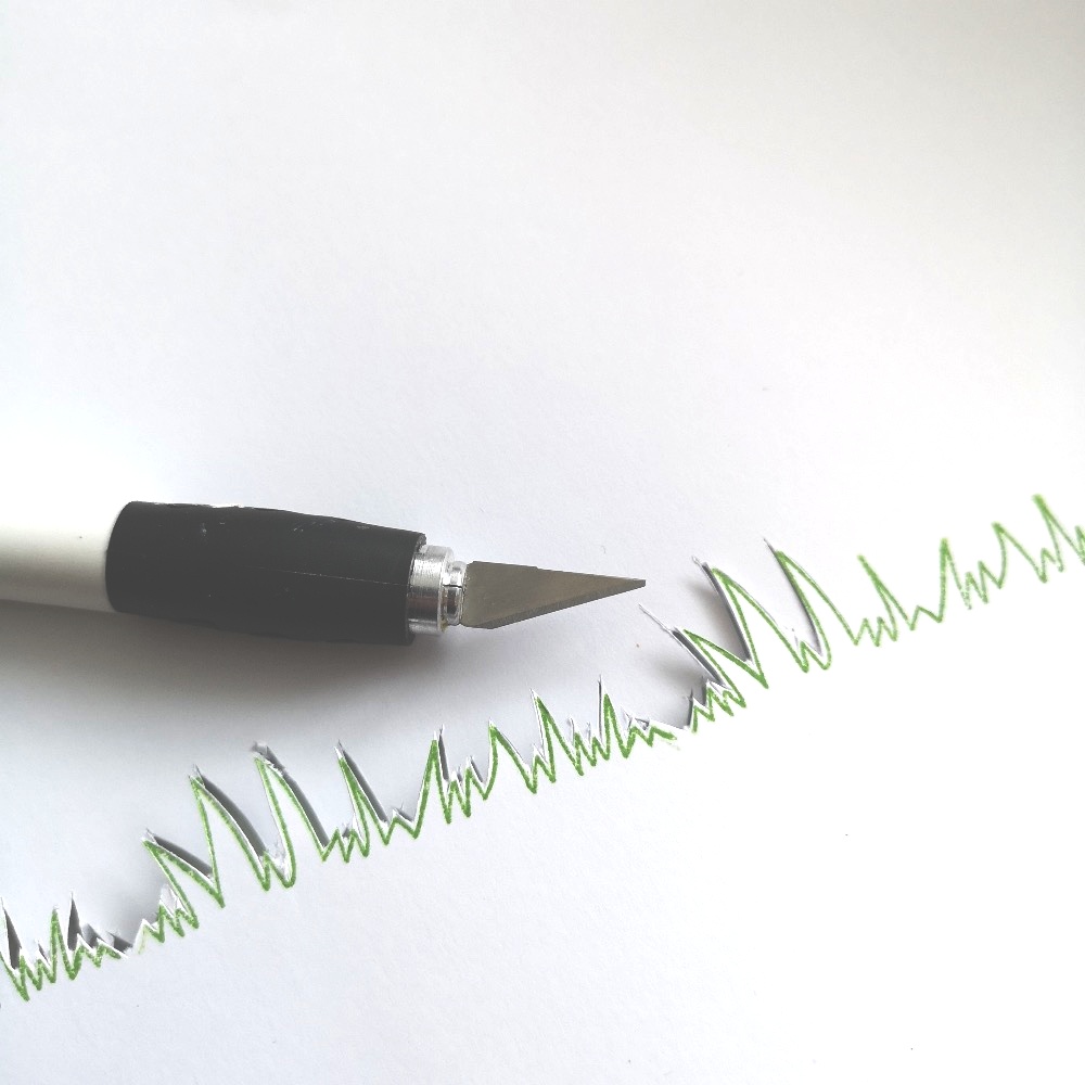 2. Vystřihneme, nebo vyřežeme skalpelem krátkými tahy vždy do špičky. TIP: skalpelem je to jednodušší než vystřihování. Přeložíme na stejné třetiny.