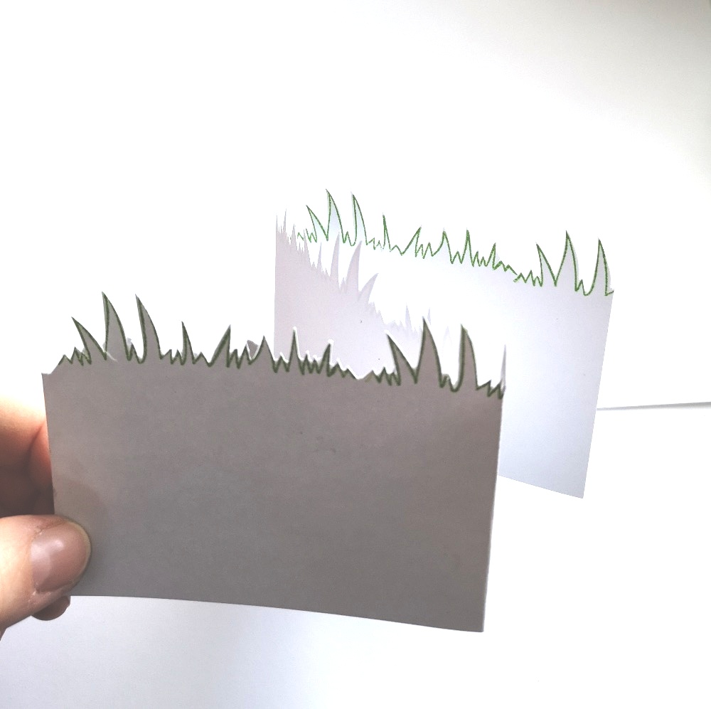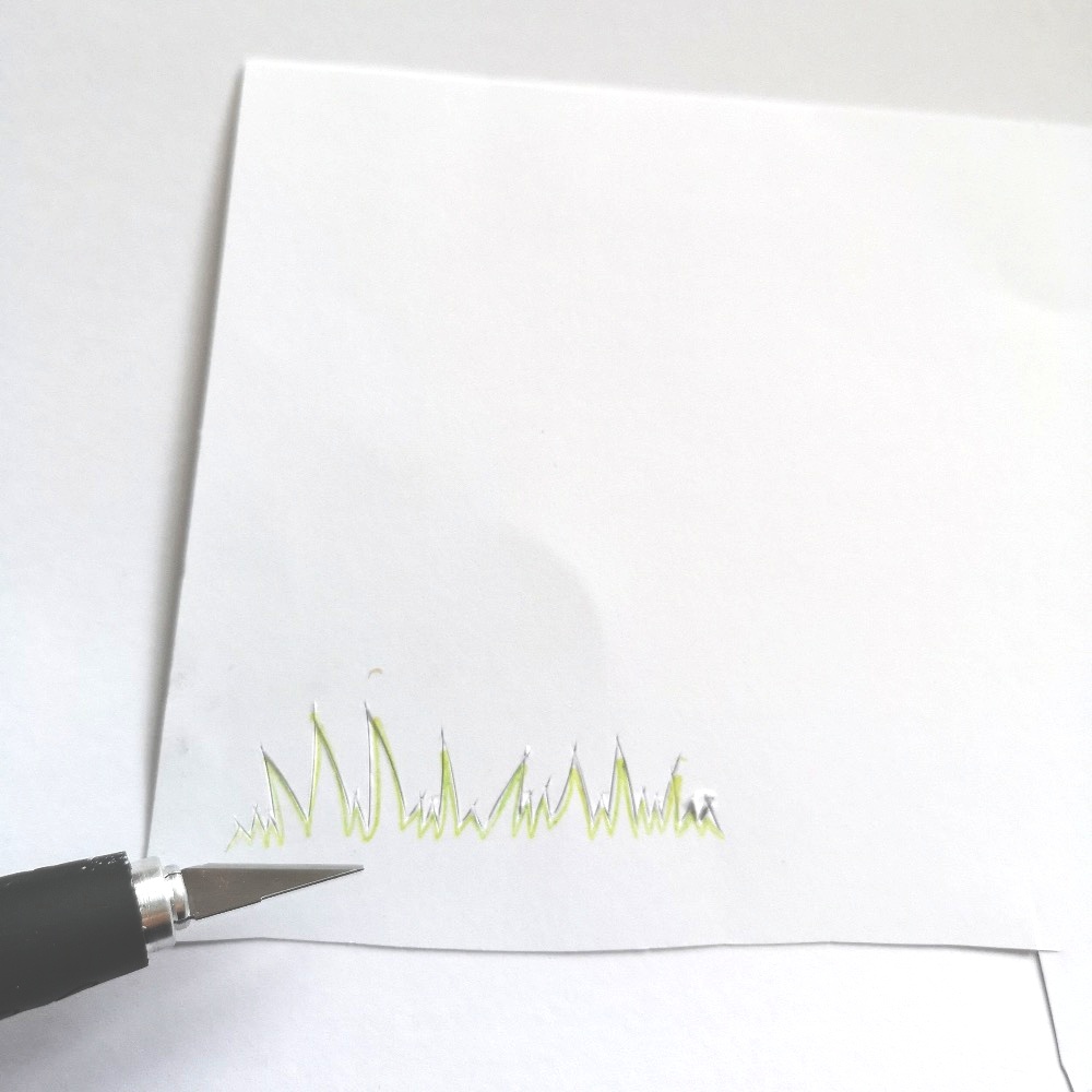 3. Na jiný kousek papíru narazítkujeme opět trávu a vystřihneme nebo vyřežeme. To bude naše šablona.