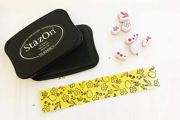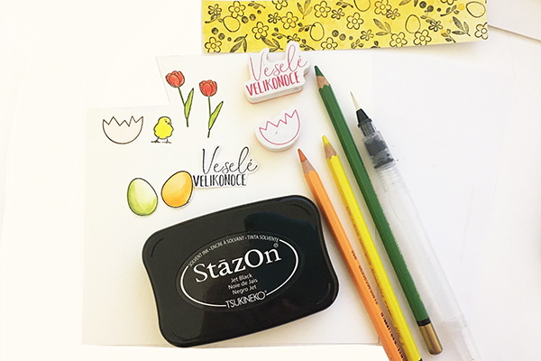 3. Na akvarelový papír narazítkujte větší velikonoční motivy, obrázky vybarvěte a vystřihněte.