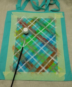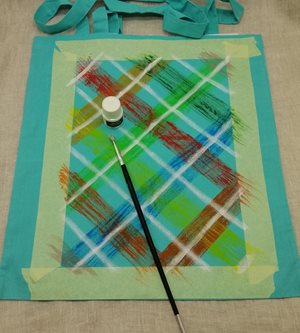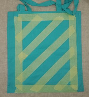 1. Vložíme igelit dovnitř tašky a polepíme papírovou páskou pracovní plochu tak, aby vznikly rovnoměrné pruhy.