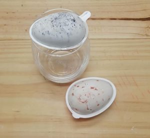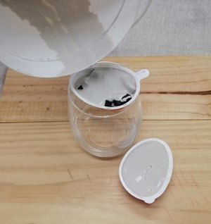 3. Sádru zamícháme s vodou a nalijeme do formiček. Během nalévaní několikrát poklepeme formičkami o stůl, abychom vyhnali vzduchové bubliny z hmoty. Tam, kde vzduch zůstane po zaschnutí, vznikne díra. Necháme sádru ztuhnout.
