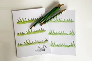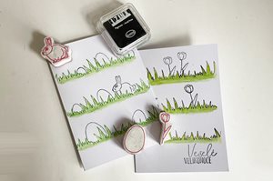1. Na přání natiskneme tři řady razítka s motivem trávy z razítkové sady Jaro a Velikonoce. Pokud máme zelený razítkovací polštářek, můžeme ho použít.