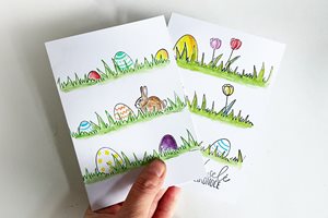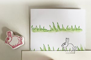 5. Do přáníčka dotiskneme motiv zajíčka, vajíček a květin. Aby nám razítka nezasahovala do již natištěné trávy, překryjeme místa, která chceme skrýt kouskem papíru.