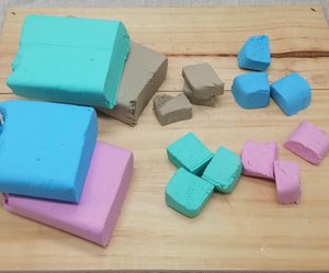 1. Nožem nakrájíme hmotu na kousky. Aby rychle nezasychala, trošku ji namočíme vodou.