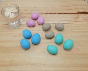 2. Namočenými prsty prohněteme kousek hmoty. Mezi dlaněmi zformujeme kuličku, ze které následně vytvarujeme vajíčko.