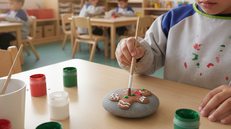 Nechte děti společně vytvořit výtvarné dílo na téma „Vánoční cukroví na kamínkách“.