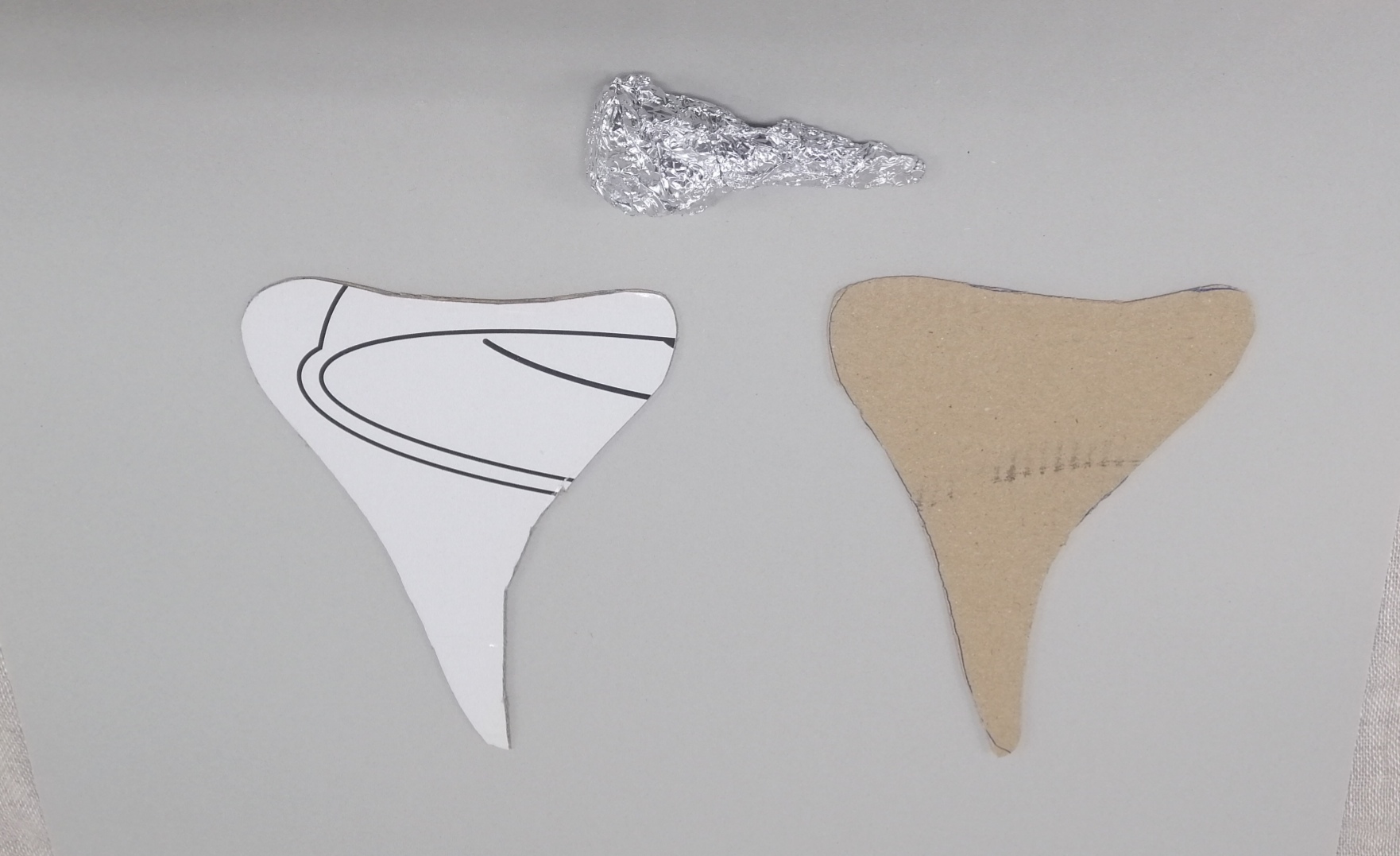 1. Z kartonu si vystřihneme 2x tvar kloboučku muchomůrky a z alobalu vytvoříme nožičku.