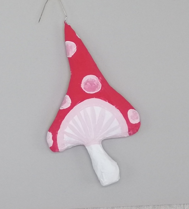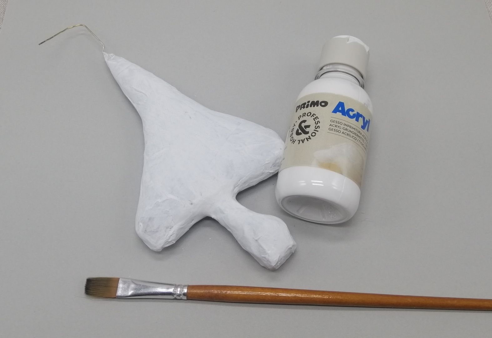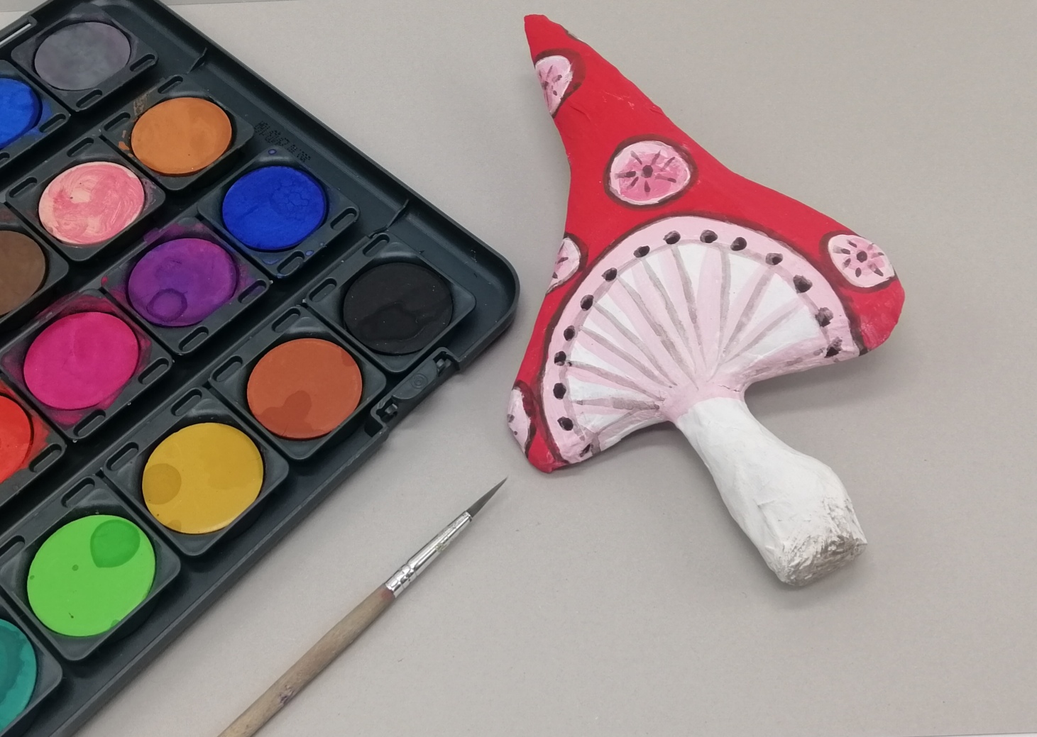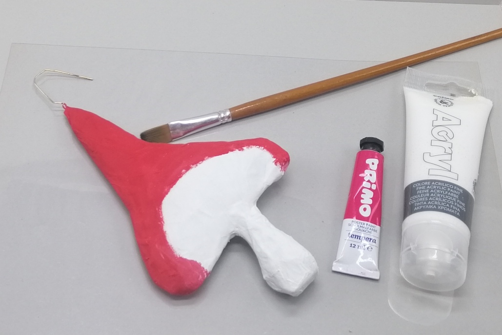 7. Bílou akrylovou barvou natřeme celou plochu muchomůrky.