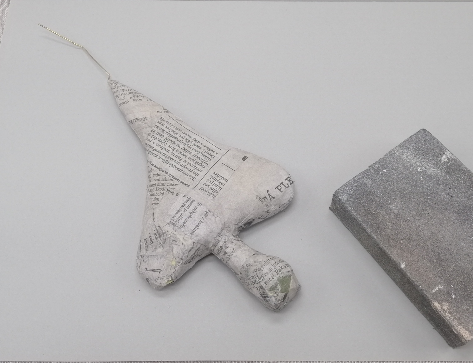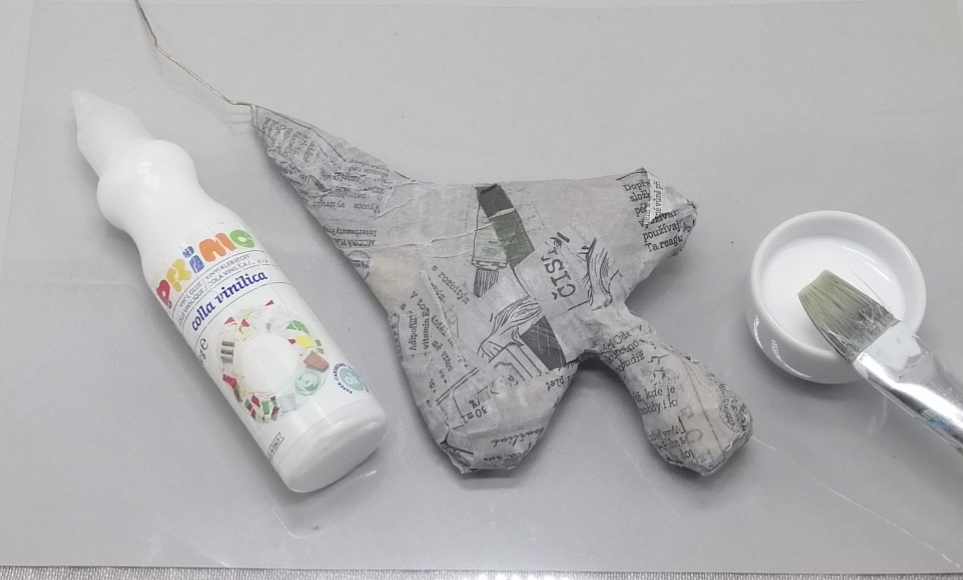 5. Vinylové lepidlo lehce naředíme vodou a s pomocí štětce polepíme muchomůrku kousky novin.